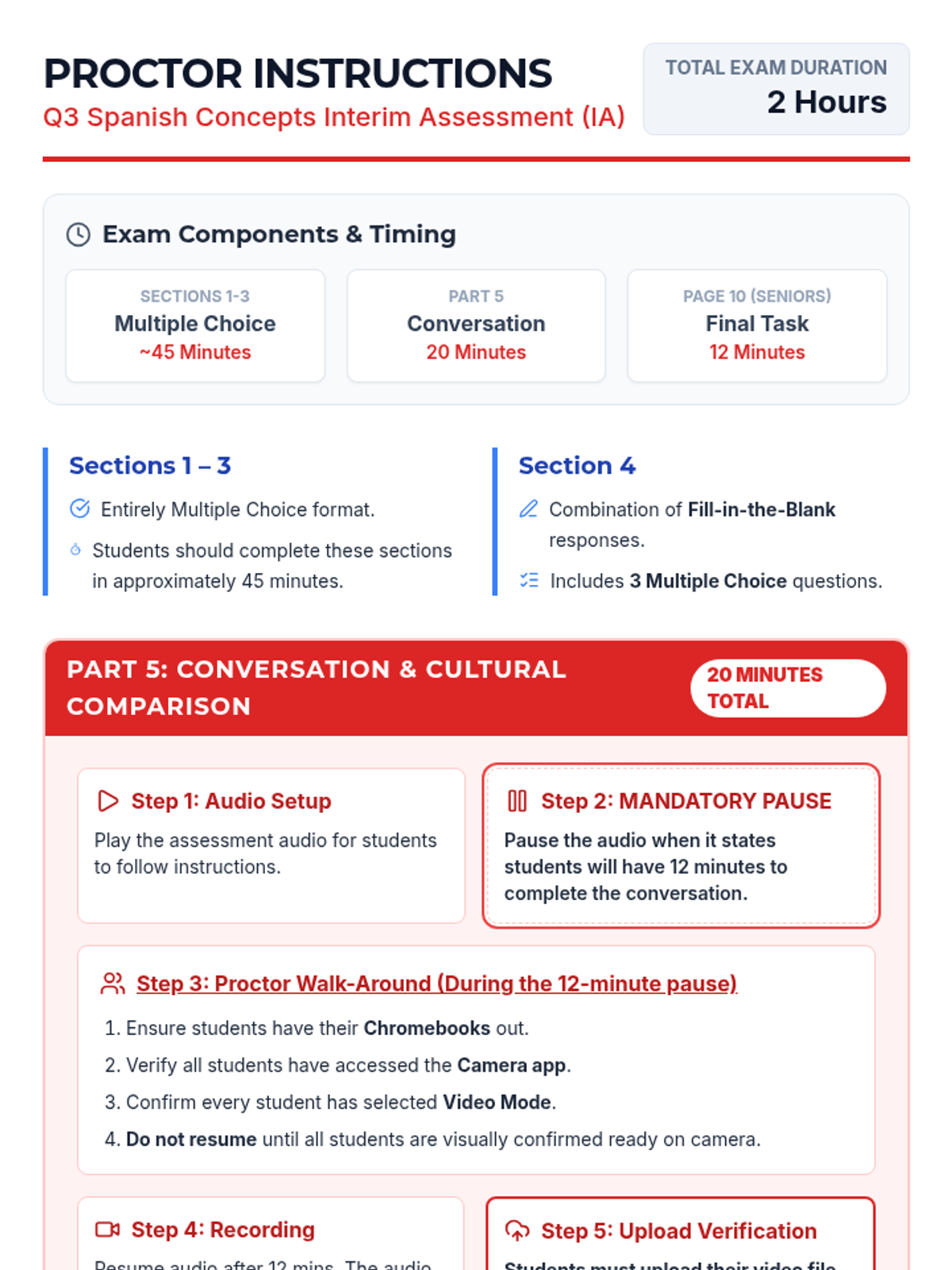 A single-page proctor instruction guide for a Spanish Interim Assessment, detailing timing for multiple-choice sections, specific audio-visual protocols for the conversation portion, and the final task for seniors.