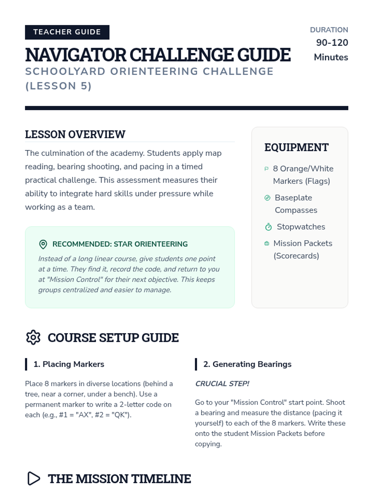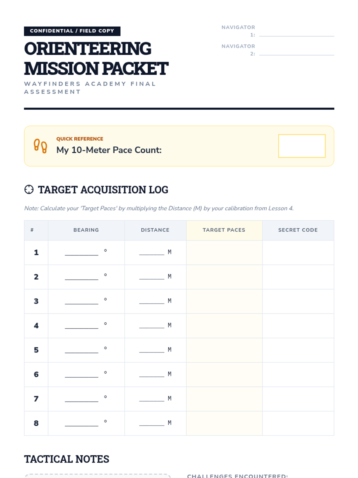 A comprehensive mission packet for the schoolyard orienteering challenge, including a data log for bearings, distances, and secret codes.