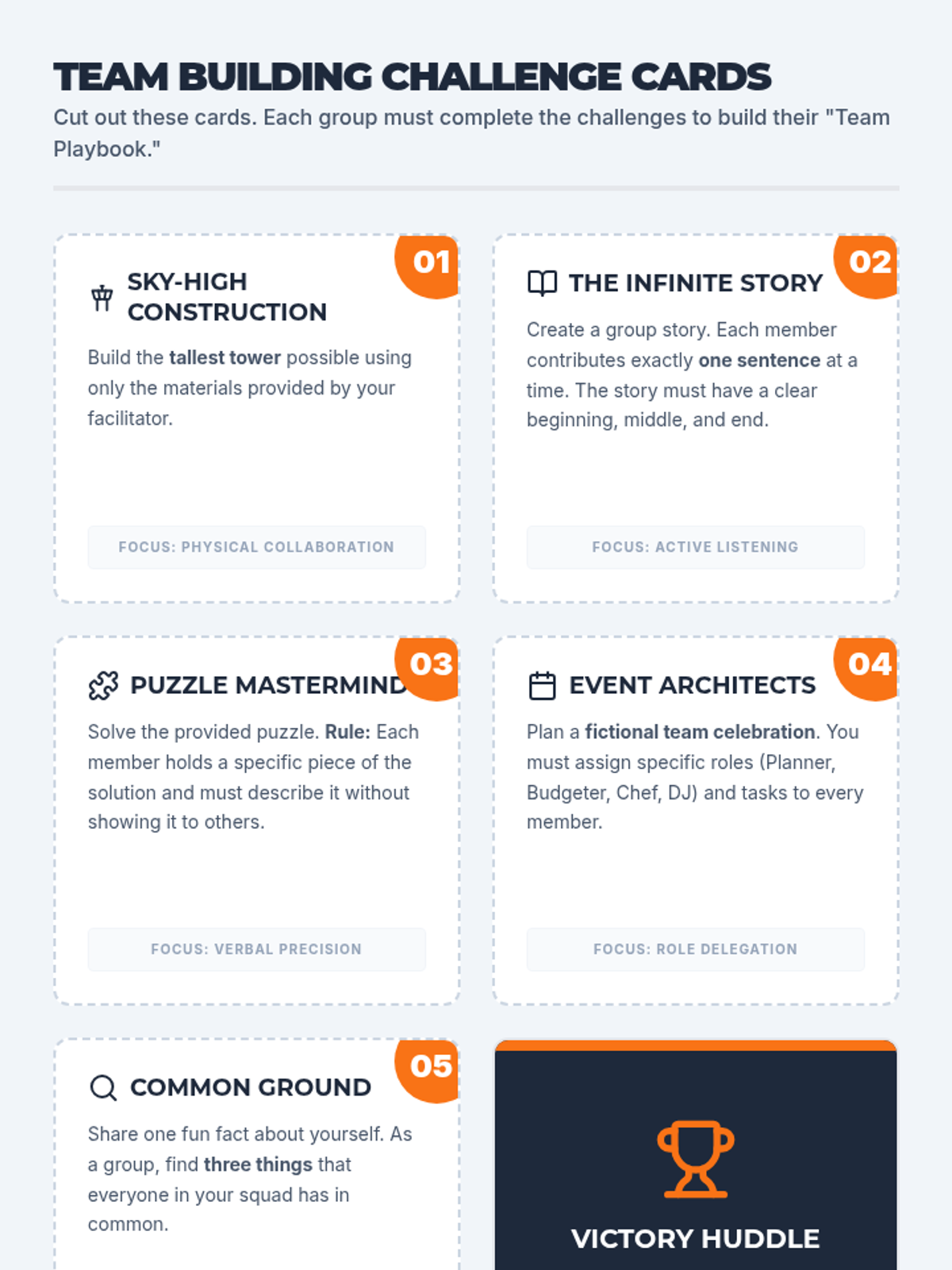 A set of six printable challenge cards for team-building activities, featuring a cohesive sports-strategy aesthetic with specific collaboration prompts.