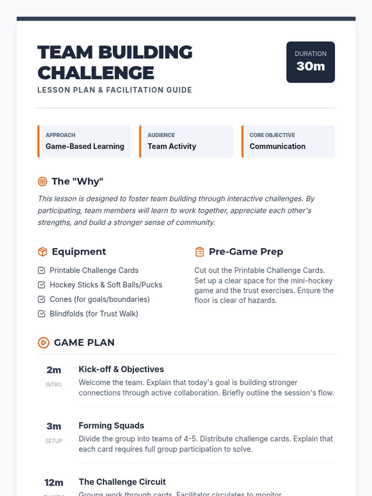 A comprehensive facilitator guide for a 30-minute team building session, including objectives, materials, and a structured instructional sequence with a sports-playbook aesthetic.