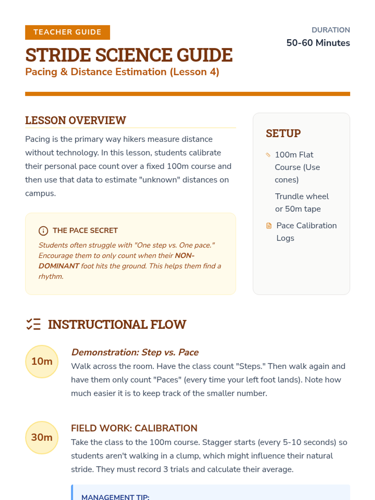 A teacher prep guide for setting up the 100m pace calibration courses on varying terrain.