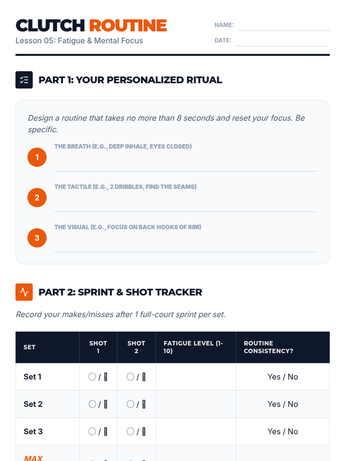 A student free throw log and routine design worksheet for Lesson 5, focusing on shooting under physical fatigue and building mental consistency. Includes a personalized ritual planner and a fatigue-tracking log.