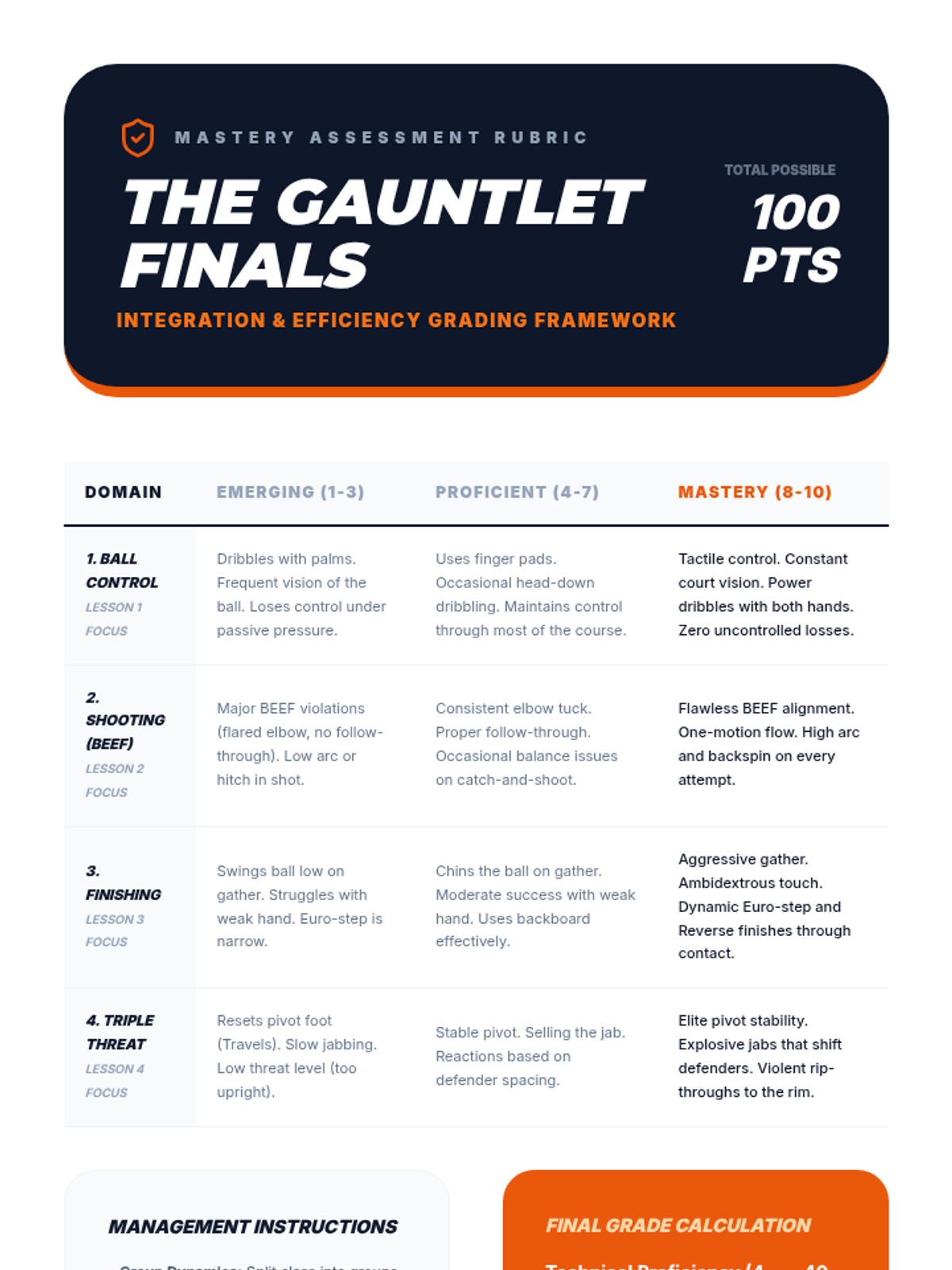 Teacher assessment rubric for Lesson 5, featuring a 4-domain scoring system (Ball Control, Shooting, Finishing, Triple Threat) for the final skills circuit.