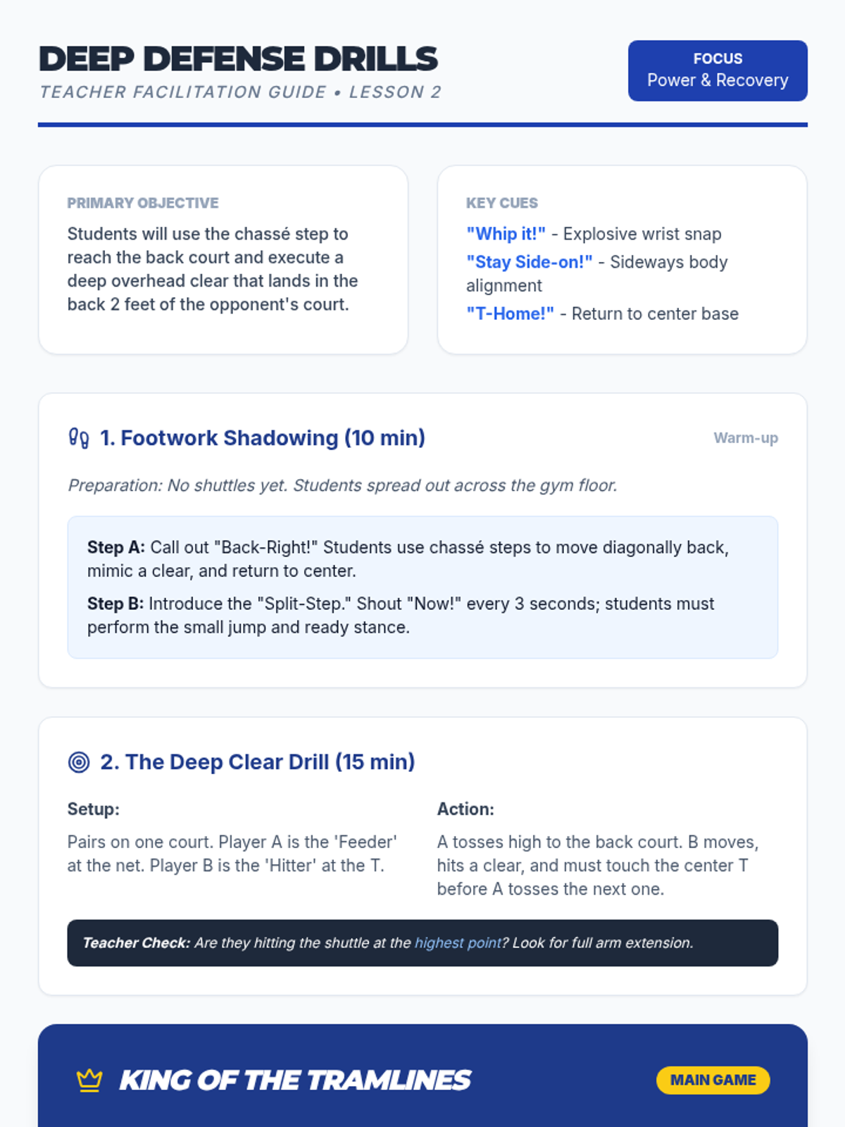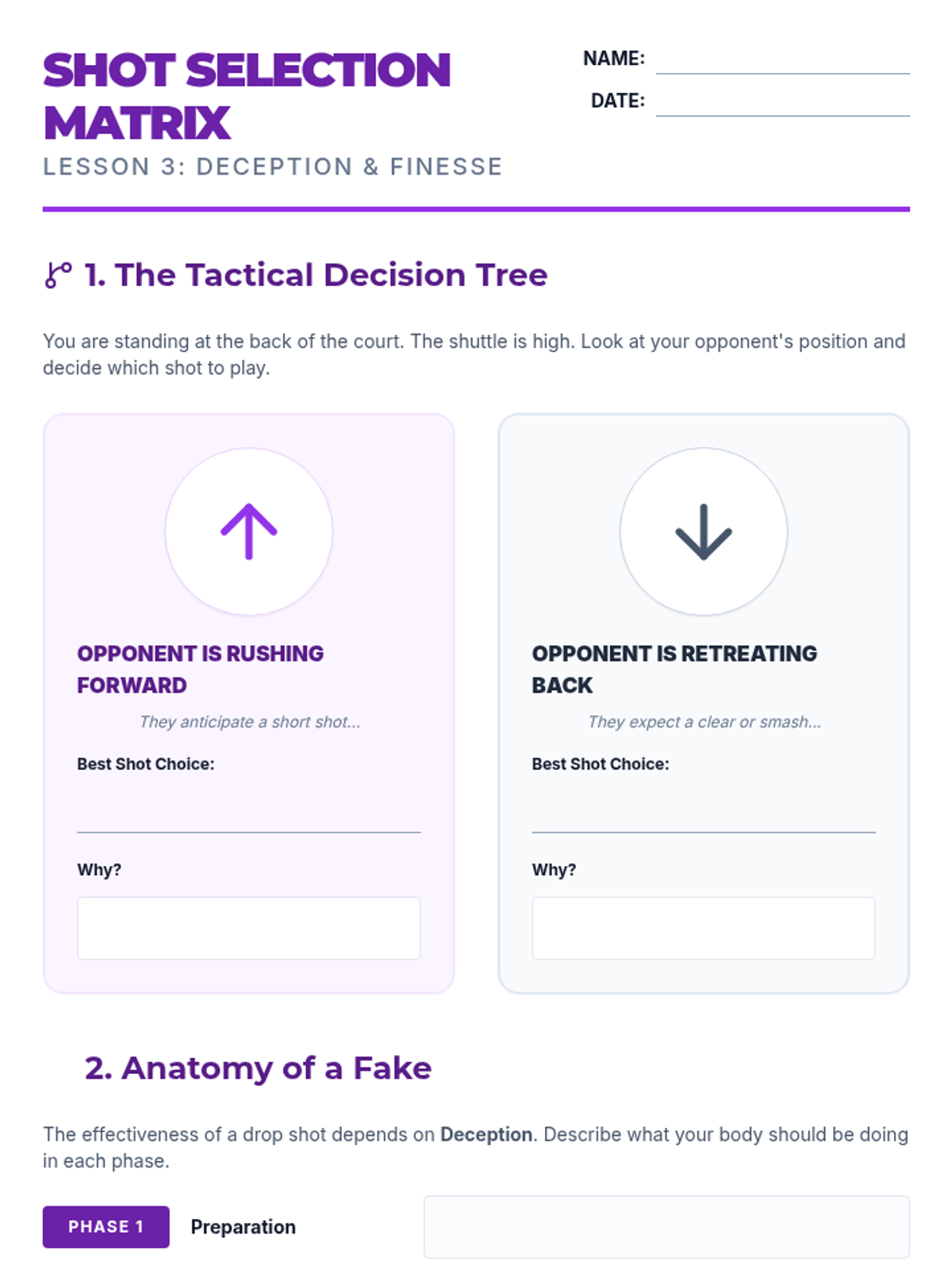 Worksheet for Lesson 3 focusing on tactical decision-making between clears and drop shots, as well as the mechanics of deceptive play.