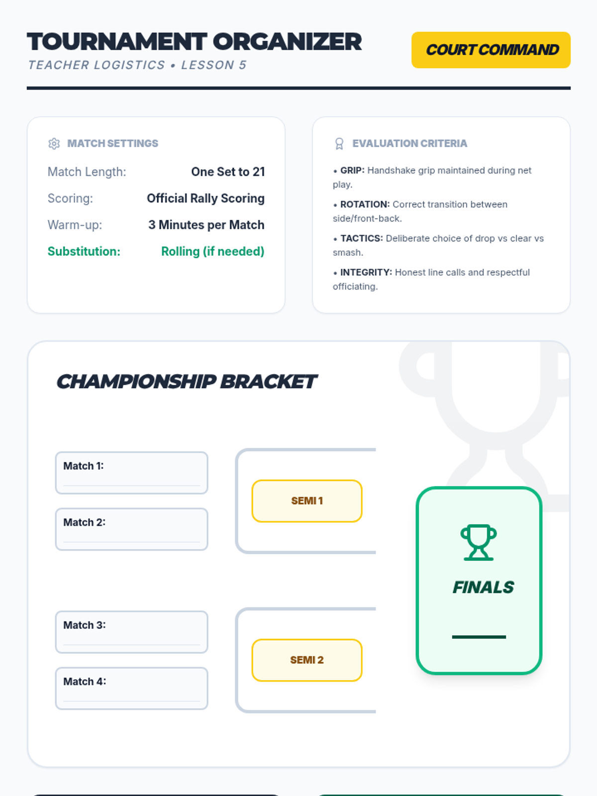 Teacher resource for organizing the end-of-unit doubles tournament, including a bracket template and officiating guidelines.