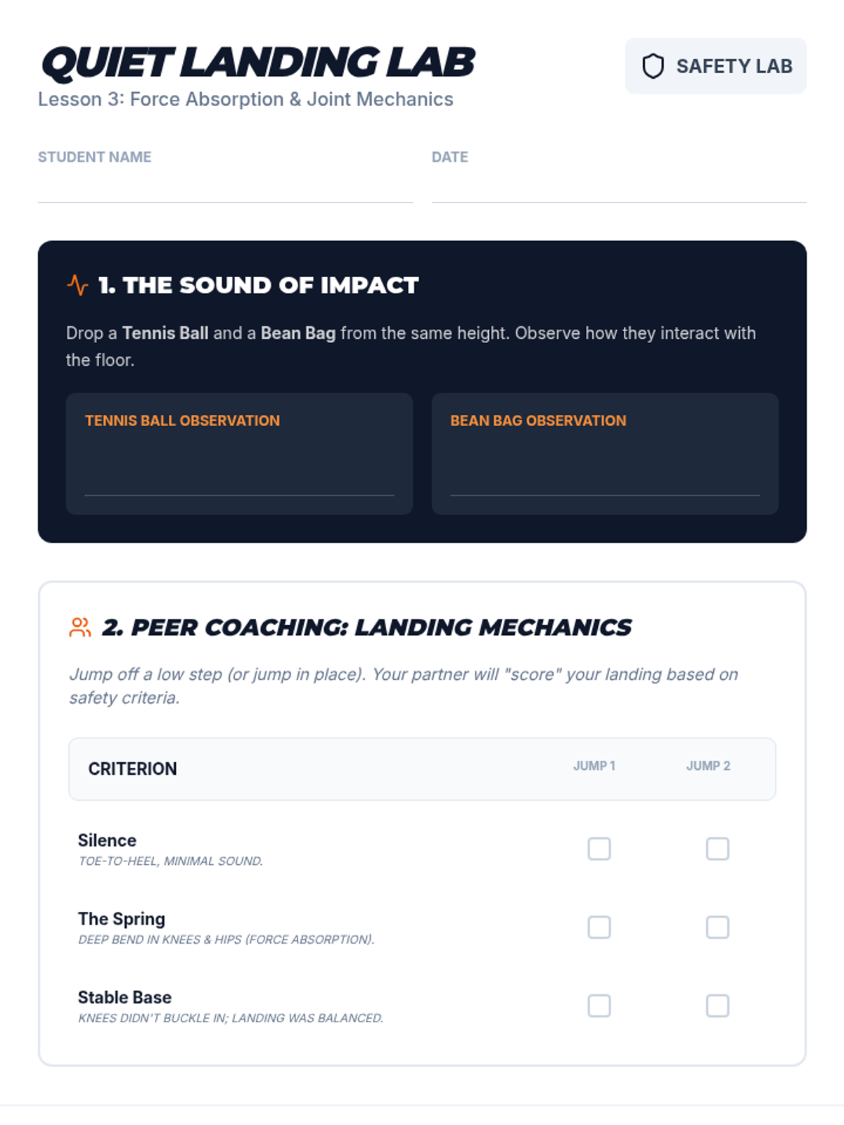 A lab sheet for Lesson 3 where students record observations from an impact simulation and use a peer-feedback checklist to master safe landing mechanics.