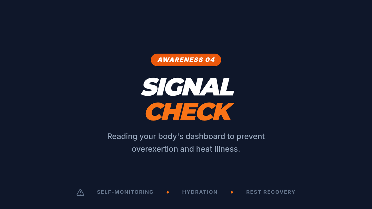 A visual presentation for Lesson 4 explaining the body's warning signals, including fatigue, dehydration, and overexertion, and how to respond safely.