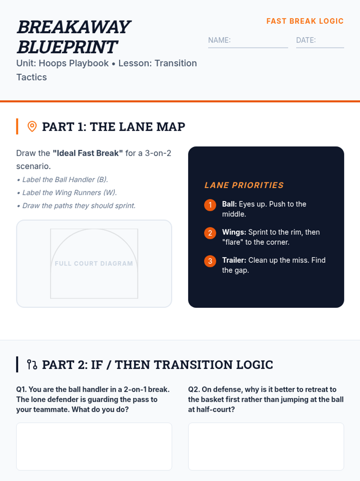Student worksheet focusing on transition lane discipline and decision-making for numerical advantages (2-on-1, 3-on-2).
