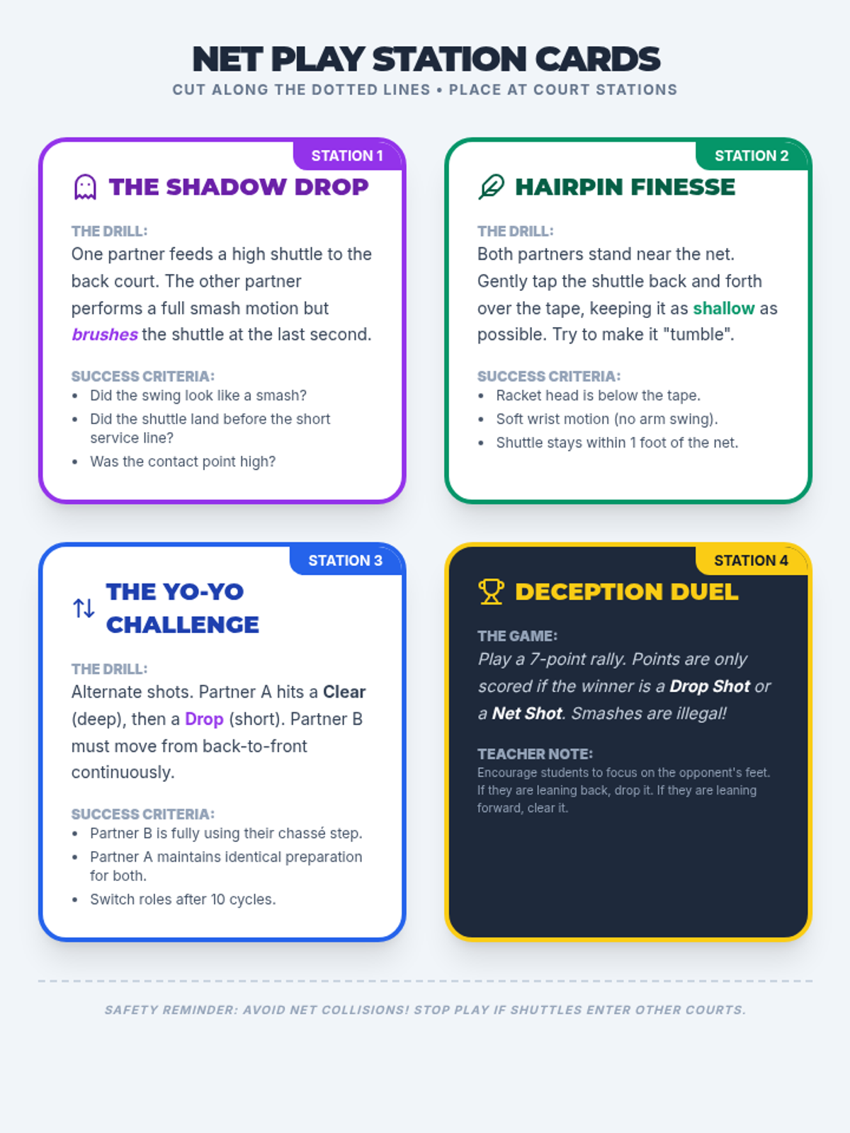Station cards for Lesson 3 providing specific drills for drop shots, hairpin net shots, and tactical movement, designed for court-side instruction.