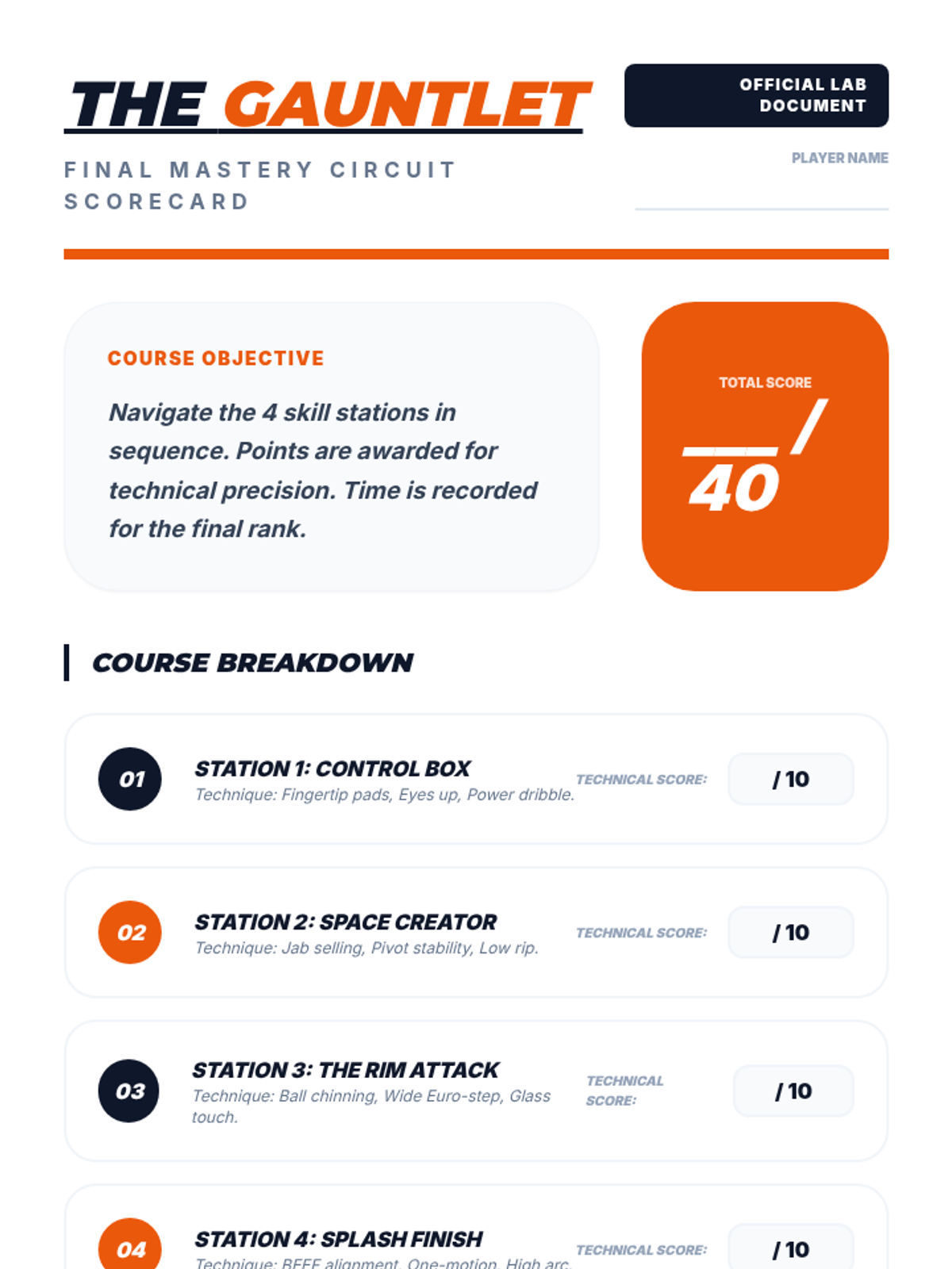 Final performance log for students during the Gauntlet skills circuit, allowing them to record their technical scores for each station and their final completion time.
