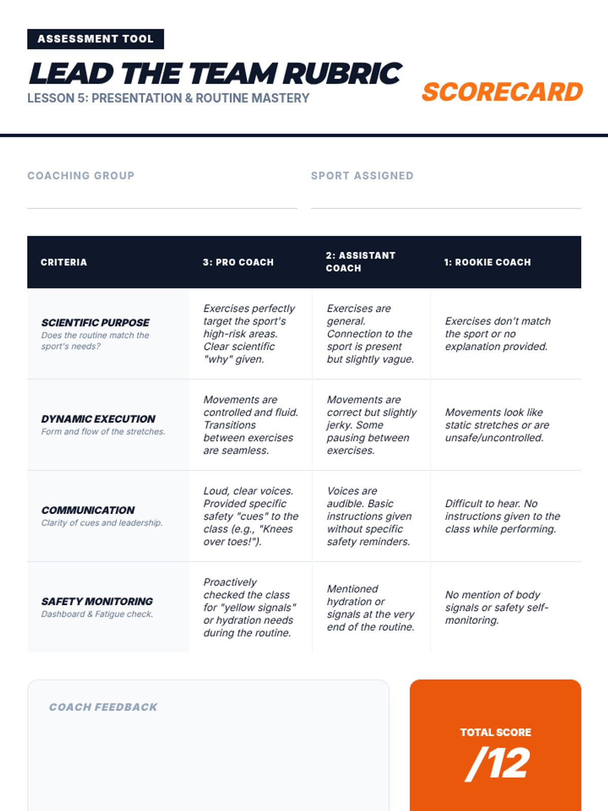 An assessment rubric for Lesson 5 used by the teacher or peers to evaluate the sport-specific warm-up routine and leadership skills of the student coaching groups.