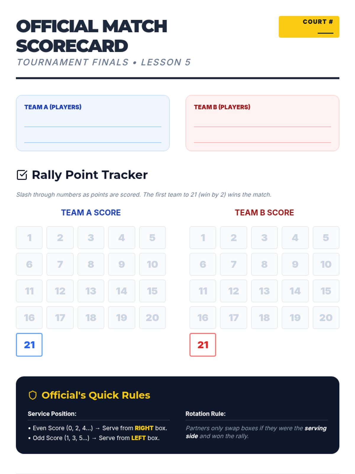 Student worksheet for tracking match scores and officiating badminton doubles games, featuring rally scoring tallies and rotation rules.