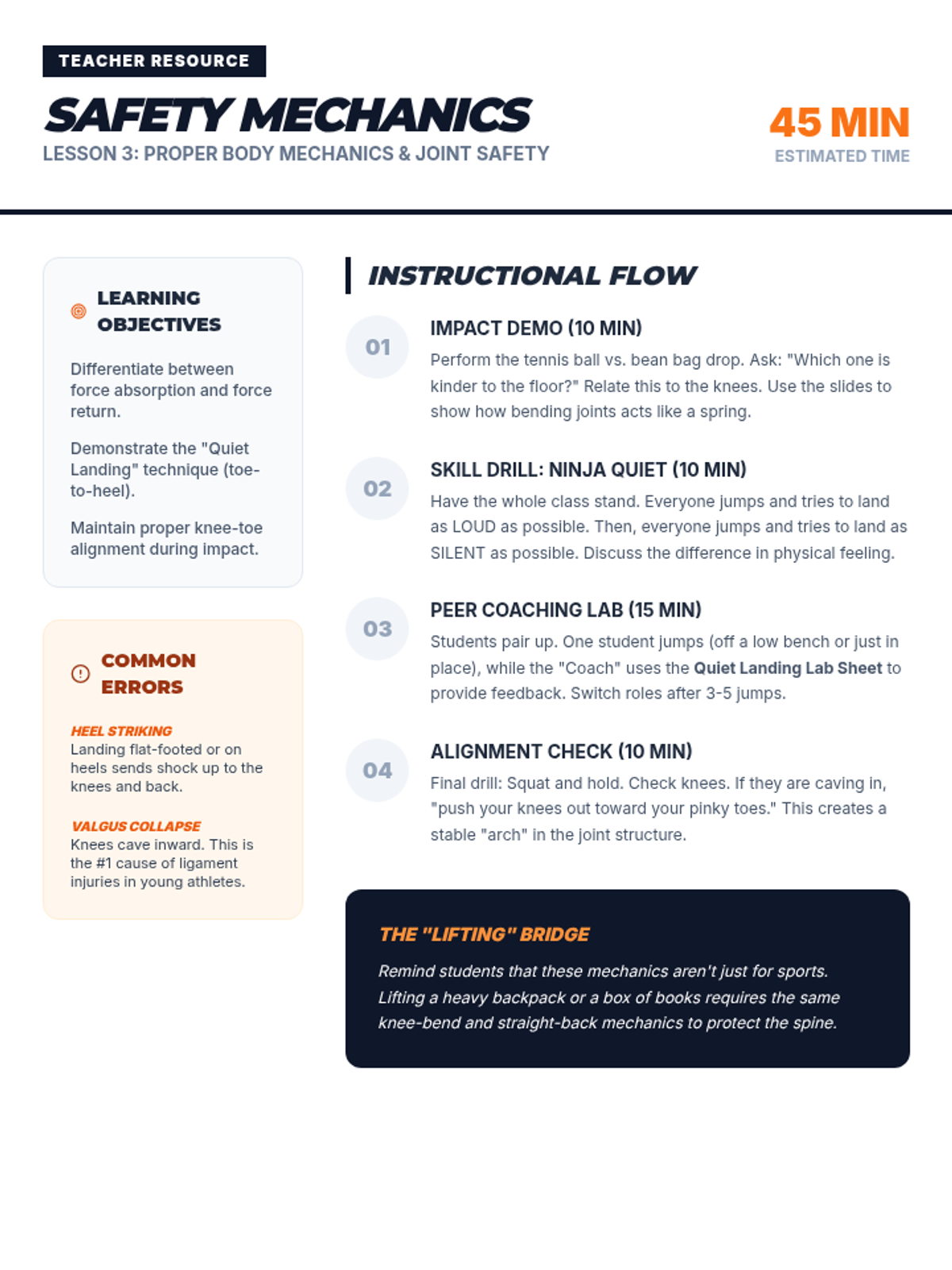 A teacher guide for Lesson 3 focusing on safety mechanics, providing coaching cues for quiet landings, and strategies for correcting common joint alignment errors.