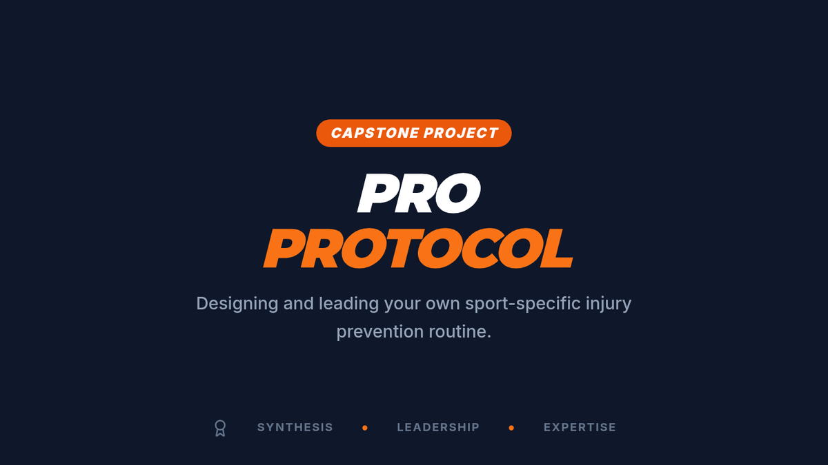 A visual presentation for Lesson 5 outlining the "Pro Protocol" capstone project, where students design and lead sport-specific warm-up routines.