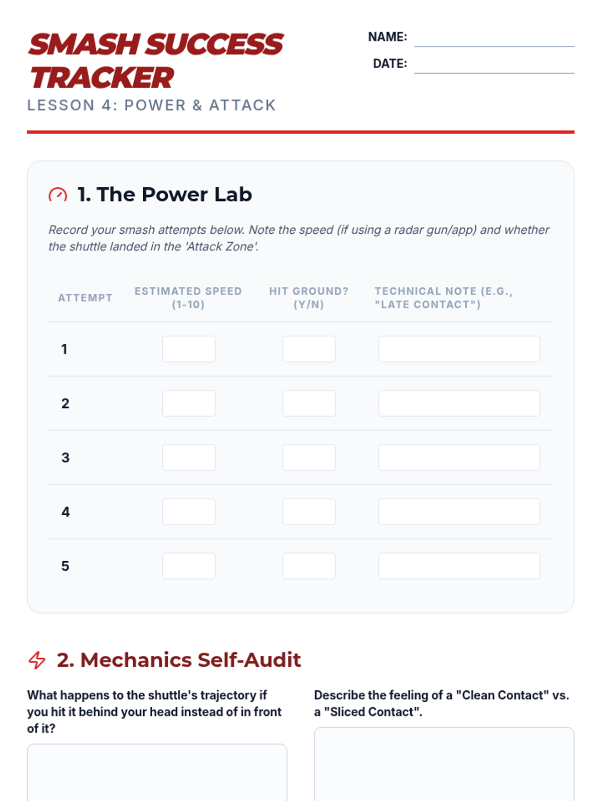 Student worksheet for tracking smash performance and mechanics, including a safety contract for aggressive play in doubles.