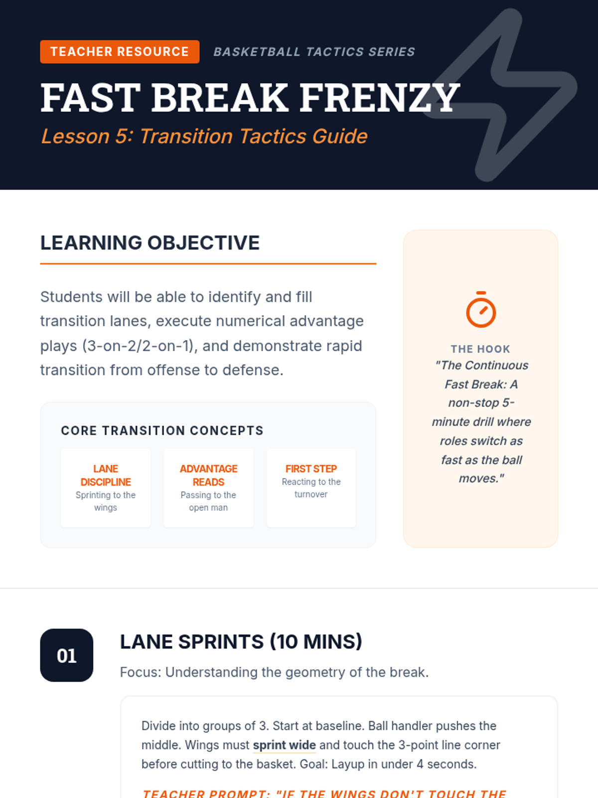 Teacher facilitation guide for Lesson 5, including Lane Sprint mechanics and the Continuous Fast Break drill instructions.