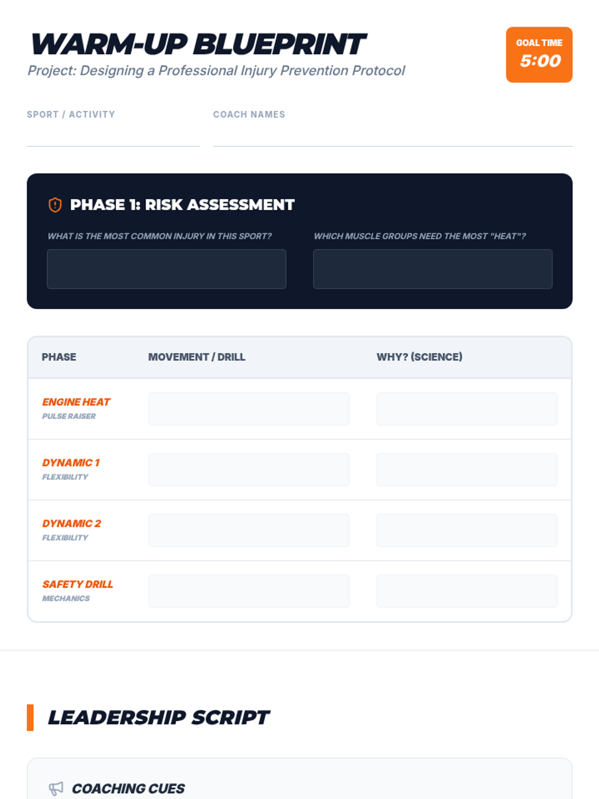 A planning document for groups to design their sport-specific warm-up routine, including risk assessment and exercise selection.