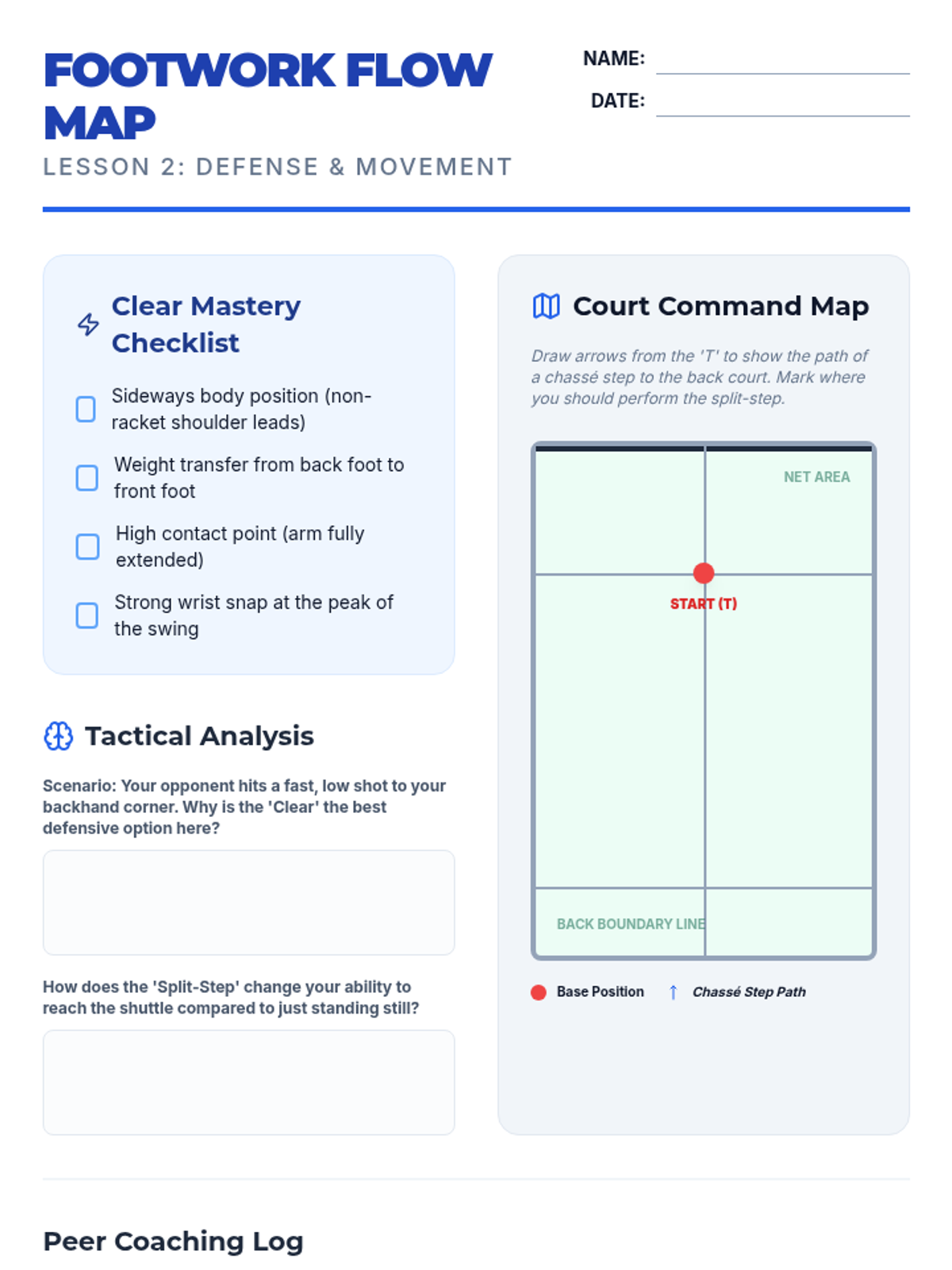 Worksheet for Lesson 2 that includes a court diagram for movement mapping, an overhead clear checklist, and tactical analysis questions.