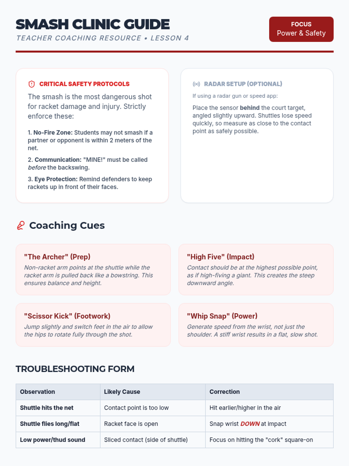 Teacher resource for Lesson 4, providing pedagogical cues for the smash, safety protocols, and a troubleshooting guide for common mechanical errors.