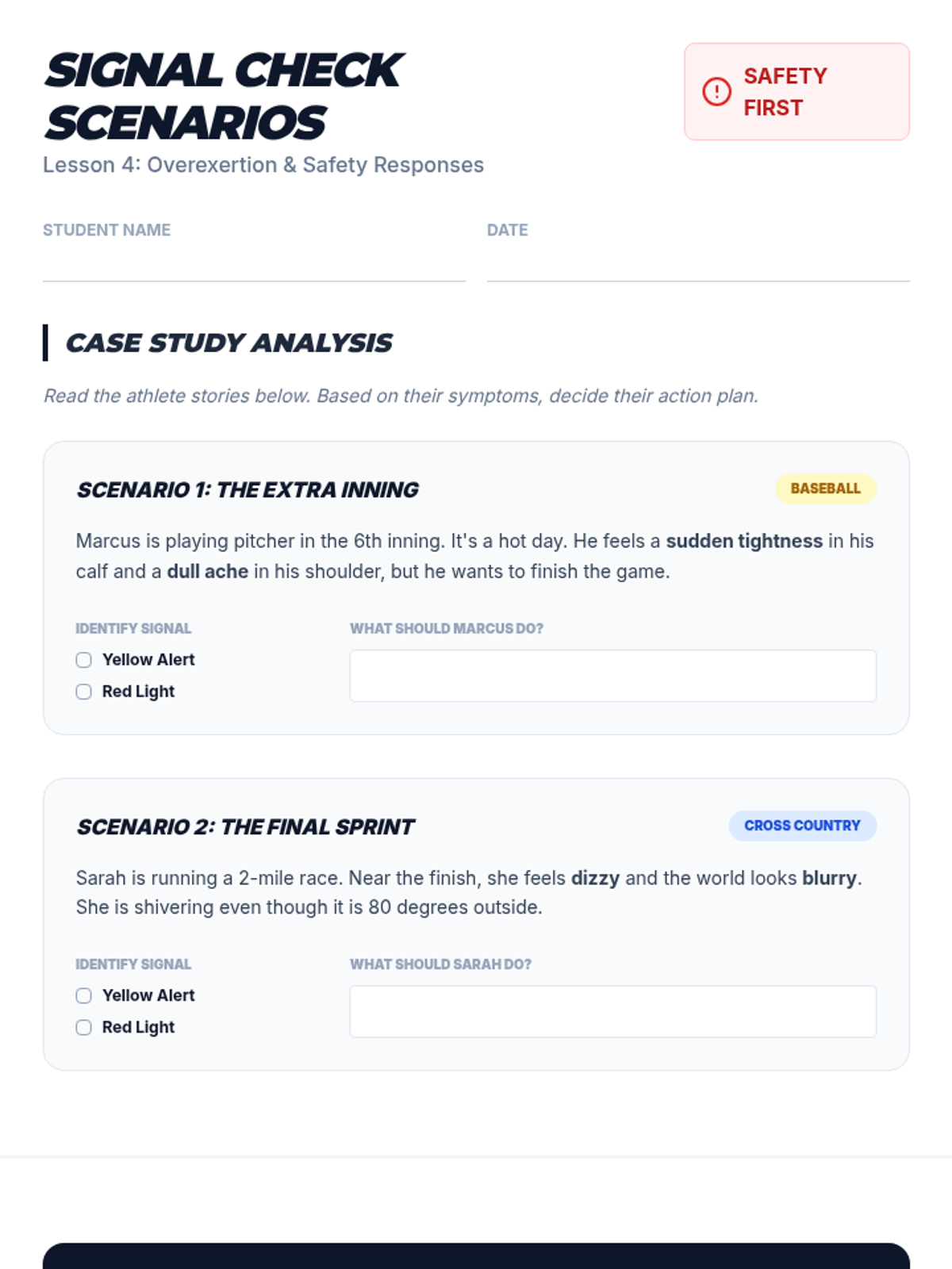 A worksheet for Lesson 4 where students analyze scenarios to identify overexertion signals and learn hydration principles for injury prevention.