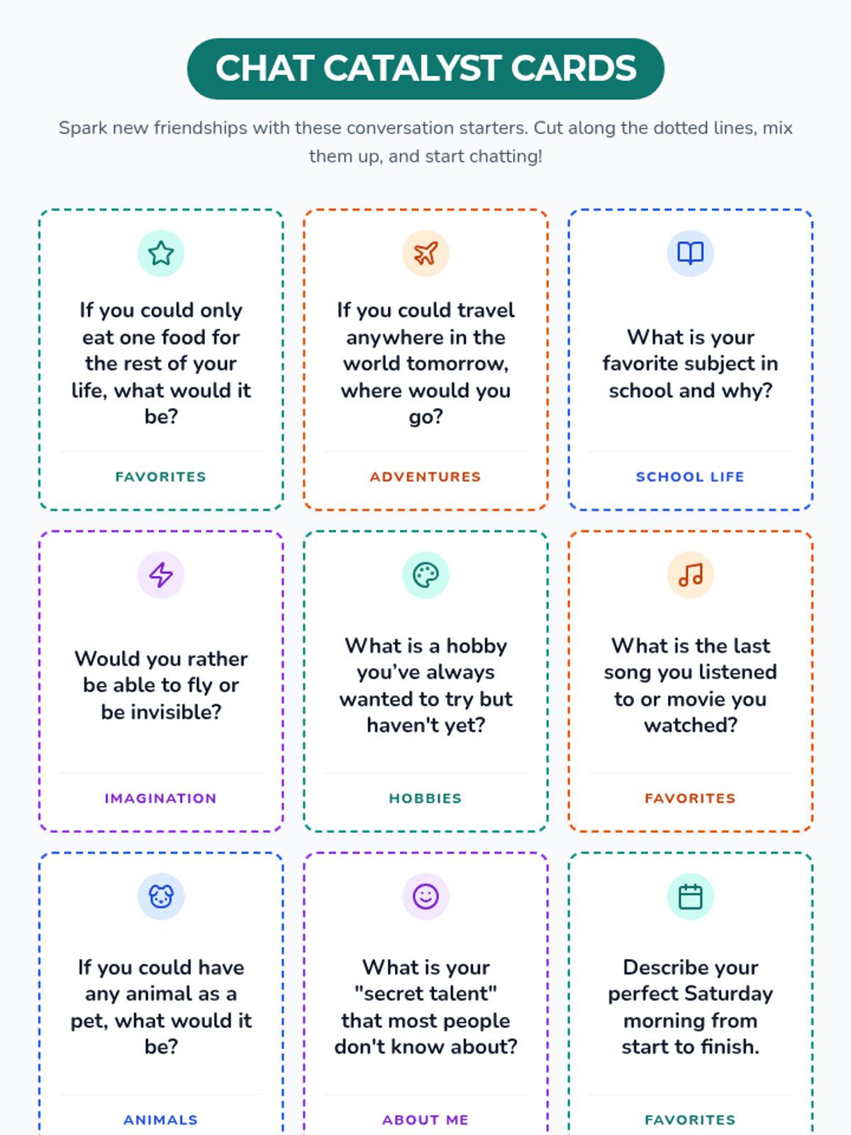 A set of printable conversation starter cards designed for students to break the ice and build new friendships. The cards feature varied prompts across categories like favorites, adventures, school life, and imagination.
