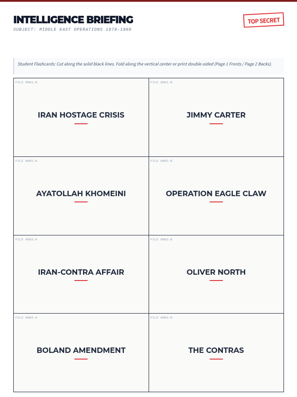 A set of 20 printable two-sided flashcards covering key Cold War terms and concepts for the US History STAAR test. The cards feature a 'confidential dossier' aesthetic and are formatted for double-sided printing with terms on the front and detailed historical significance on the back.