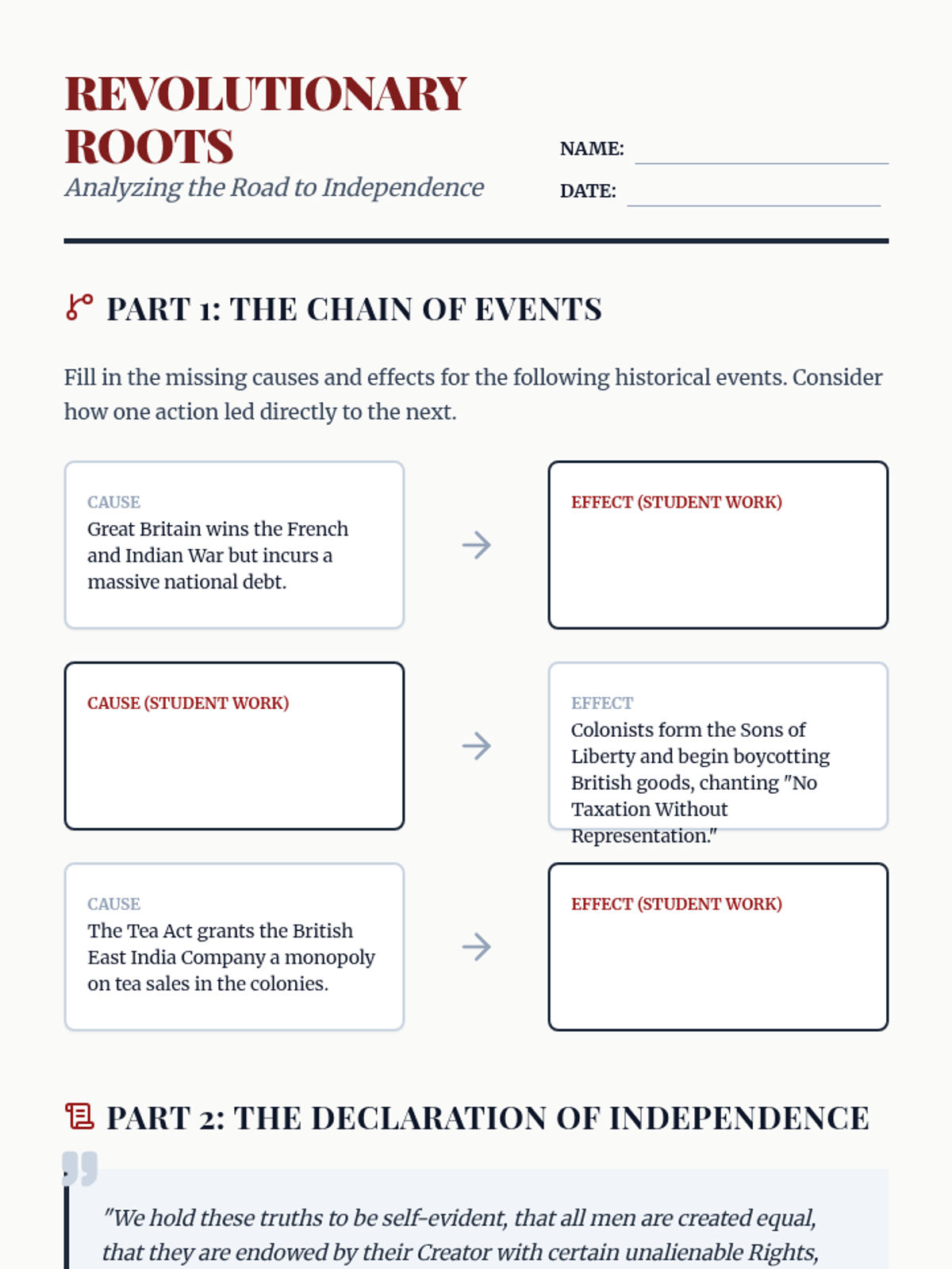 Founding of the United StatesExamines the drafting of the Declaration of Independence, the Revolutionary War's impact, and the creation of the U.S. Constitution. Connects Enlightenment ideals to the development of early American democratic institutions and federalism.