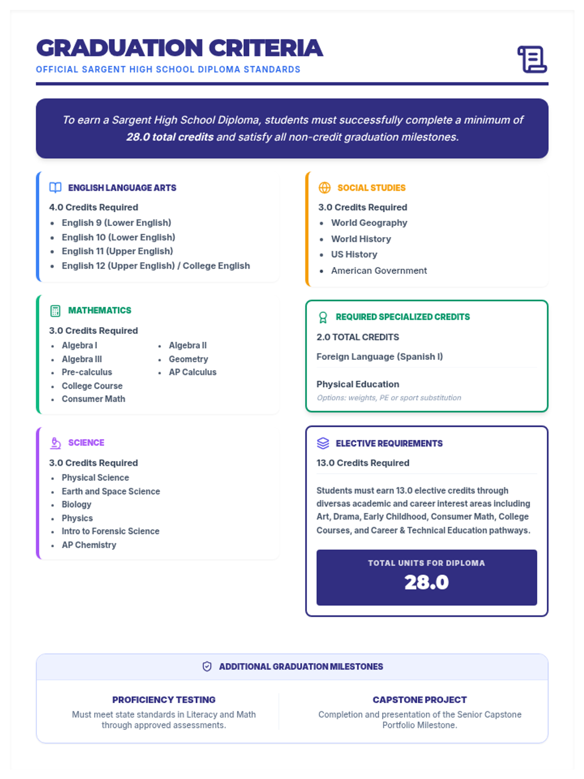 A comprehensive reference sheet outlining high school graduation requirements, reverted to the original 2-column layout optimized for a single-page fit. Science subjects are broken out individually and Social Studies is streamlined. All credit-level annotations like "1.0" have been removed from individual courses. Physical Education options clarified. Highlighting for Consumer Math and American Government has been removed. American Government is no longer bold. Elective pathways list removed from the description for a cleaner look.