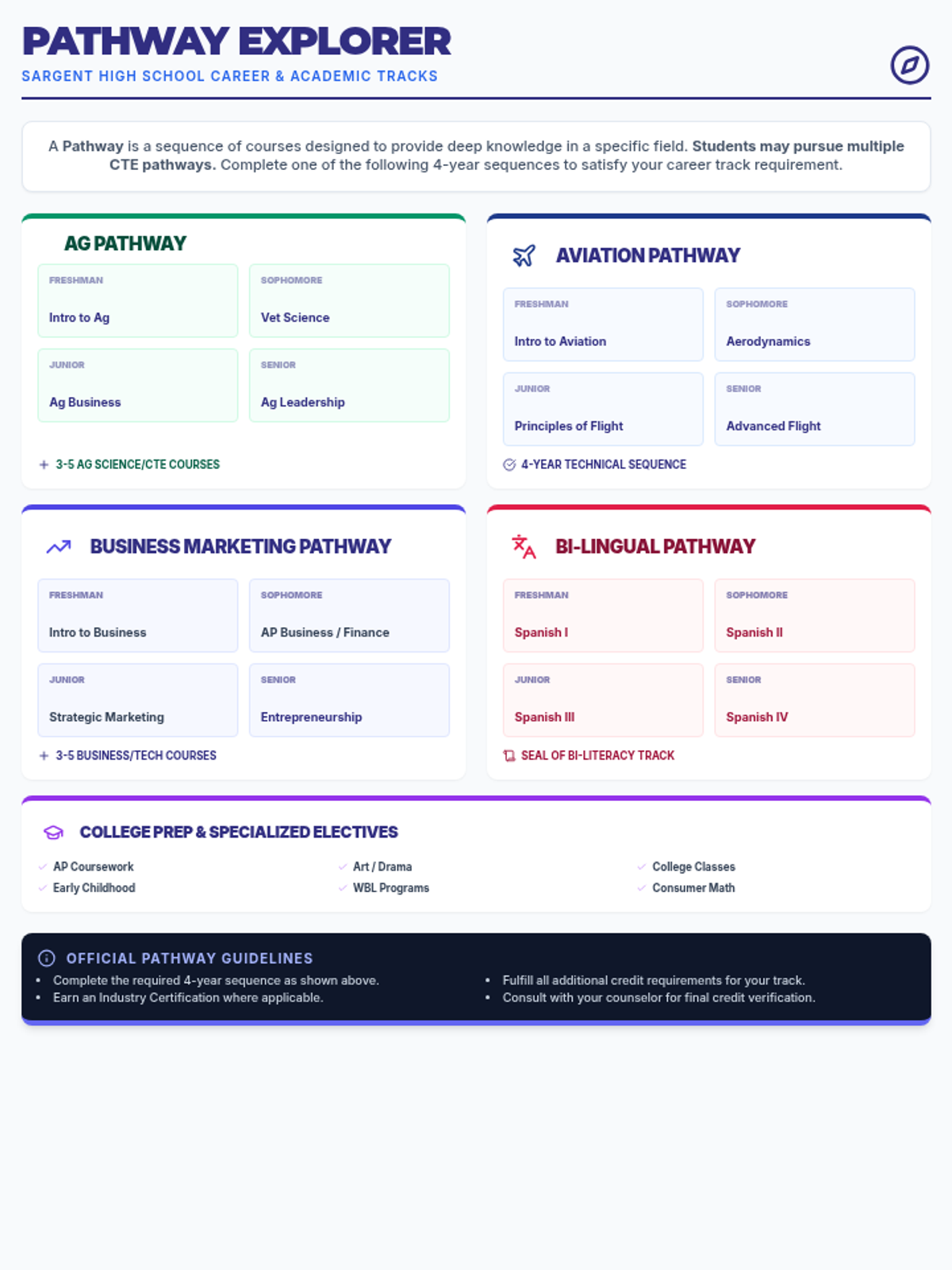 A supplementary handout providing the specific 4-year course sequences for the AG, Aviation, Business Marketing, and Bi-Lingual Pathways. Renamed back to Aviation Pathway. Optimized for a single-page layout. All credit-level annotations like "1.0" have been removed.