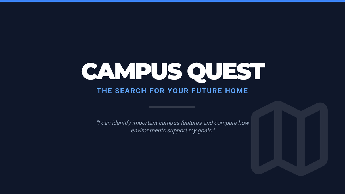 A visually engaging slide deck to accompany the Campus Quest lesson, illustrating the "Four Pillars" of college choice (Size, Location, Academics, and Culture) to help students prepare for virtual campus tours.