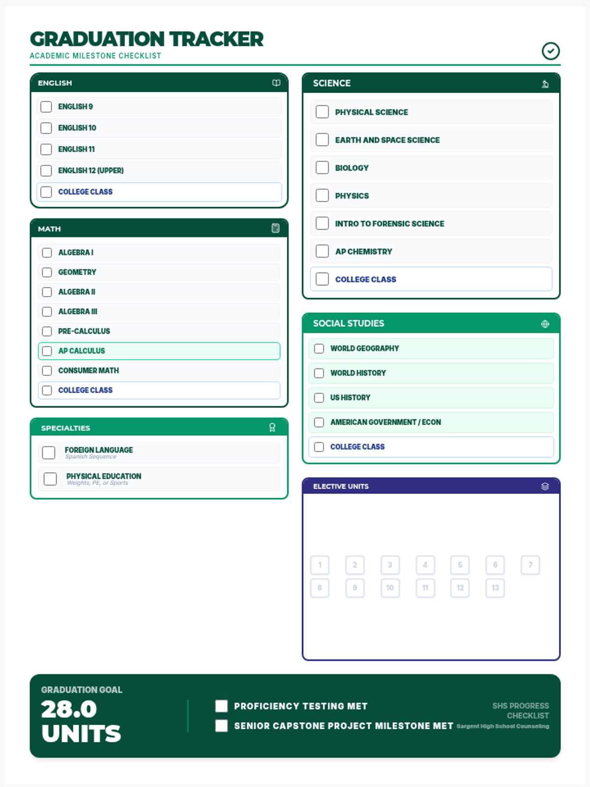 A comprehensive graduation tracker checklist for high school students, featuring updated 28.0 credit total and the Capstone Project milestone. English 12 now labeled as (Upper). American Government is listed as American Government / Econ. Math section updated with AP Calculus (Green) and College Class (Blue). Geometry placed after Algebra I. Science subjects broken out individually. Optimized for a robust single-page fit. All credit-level annotations like "1.0" have been removed. Science and Math broken out individually.