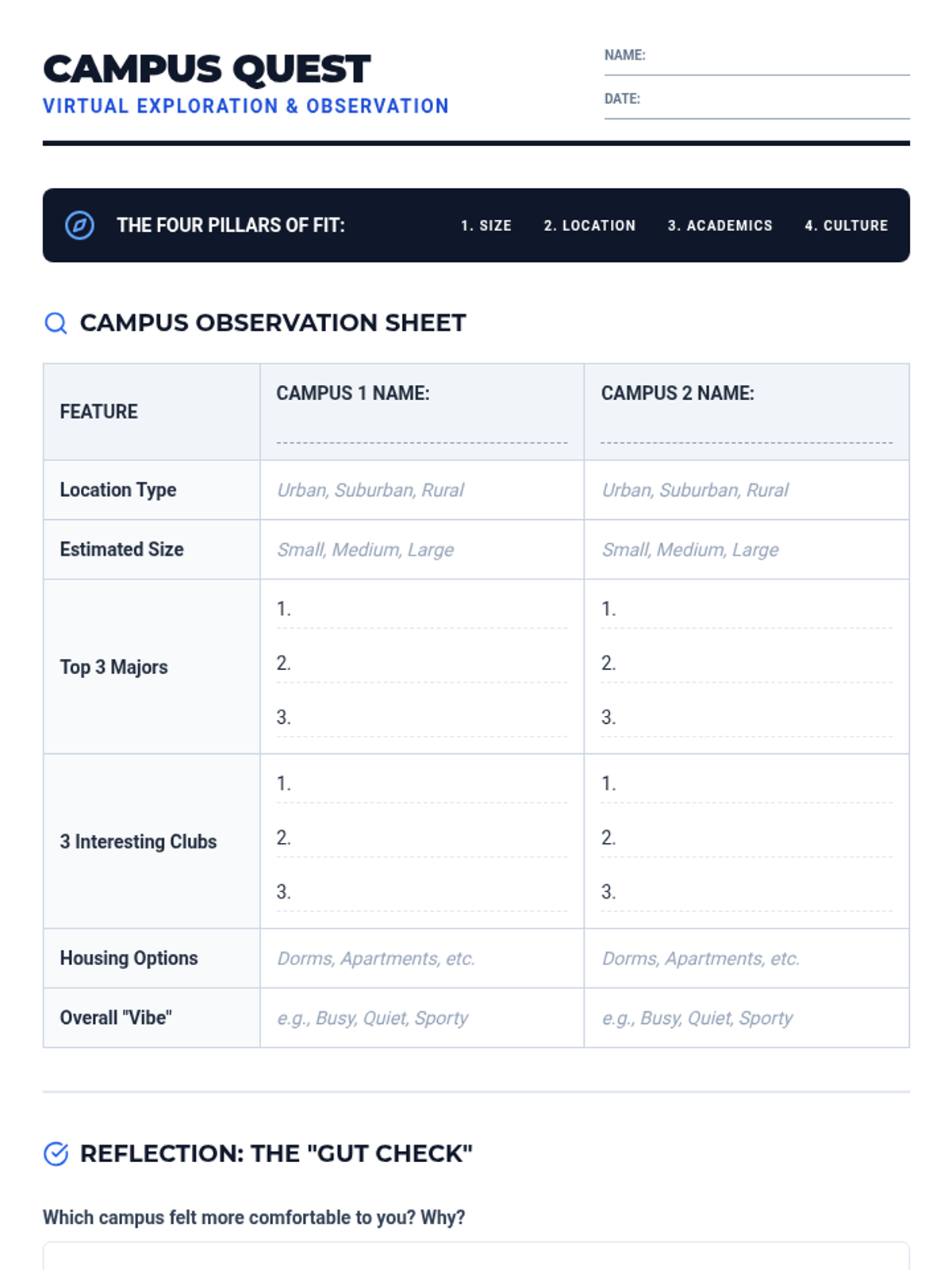 A student-facing observation sheet and reflection guide for virtual college tours, featuring a comparison table for two campuses and "gut check" reflection questions.