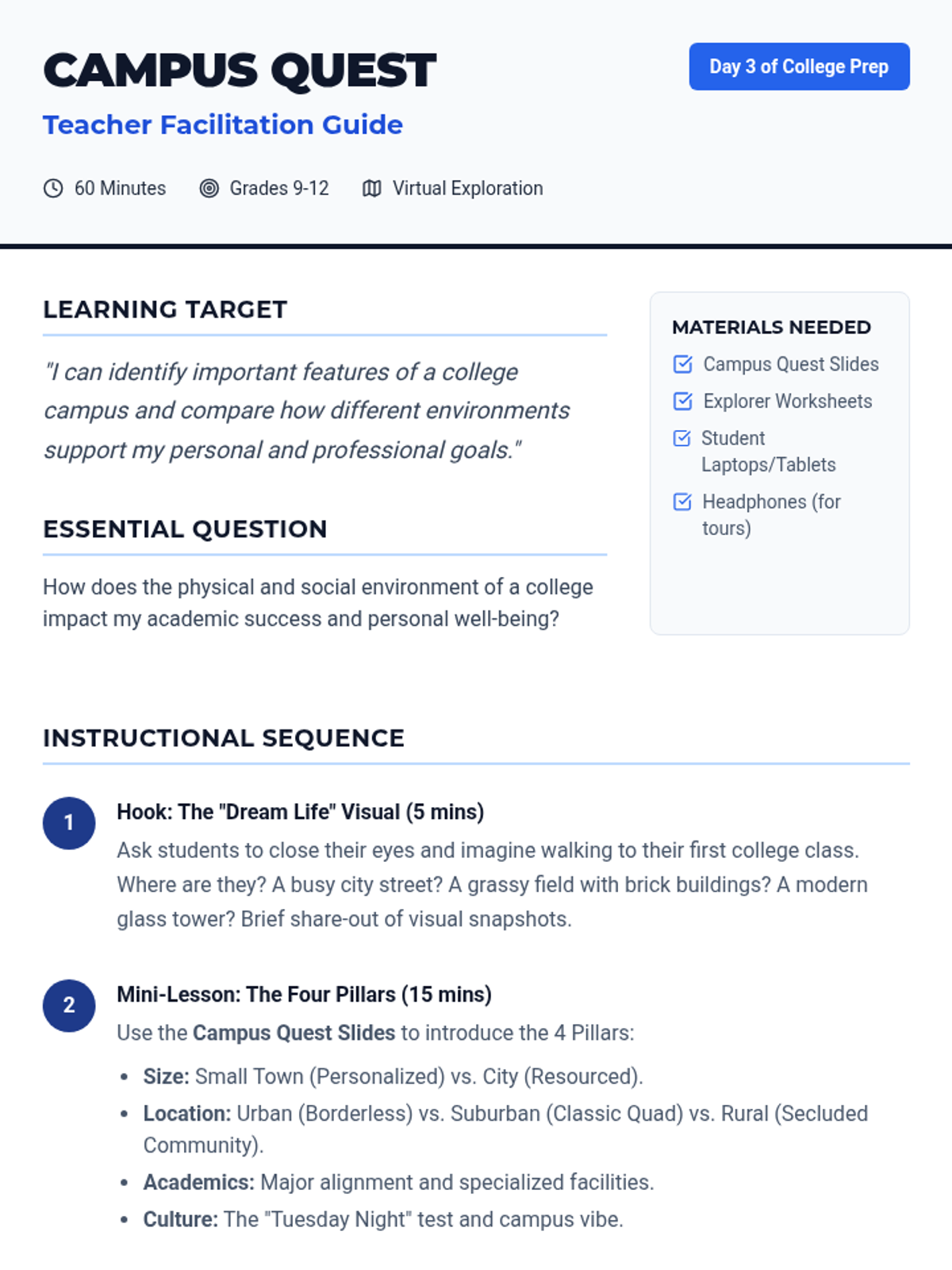A comprehensive teacher facilitation guide for the Campus Quest lesson, featuring learning targets, a detailed 60-minute instructional sequence, and discussion prompts for guiding virtual college tours.