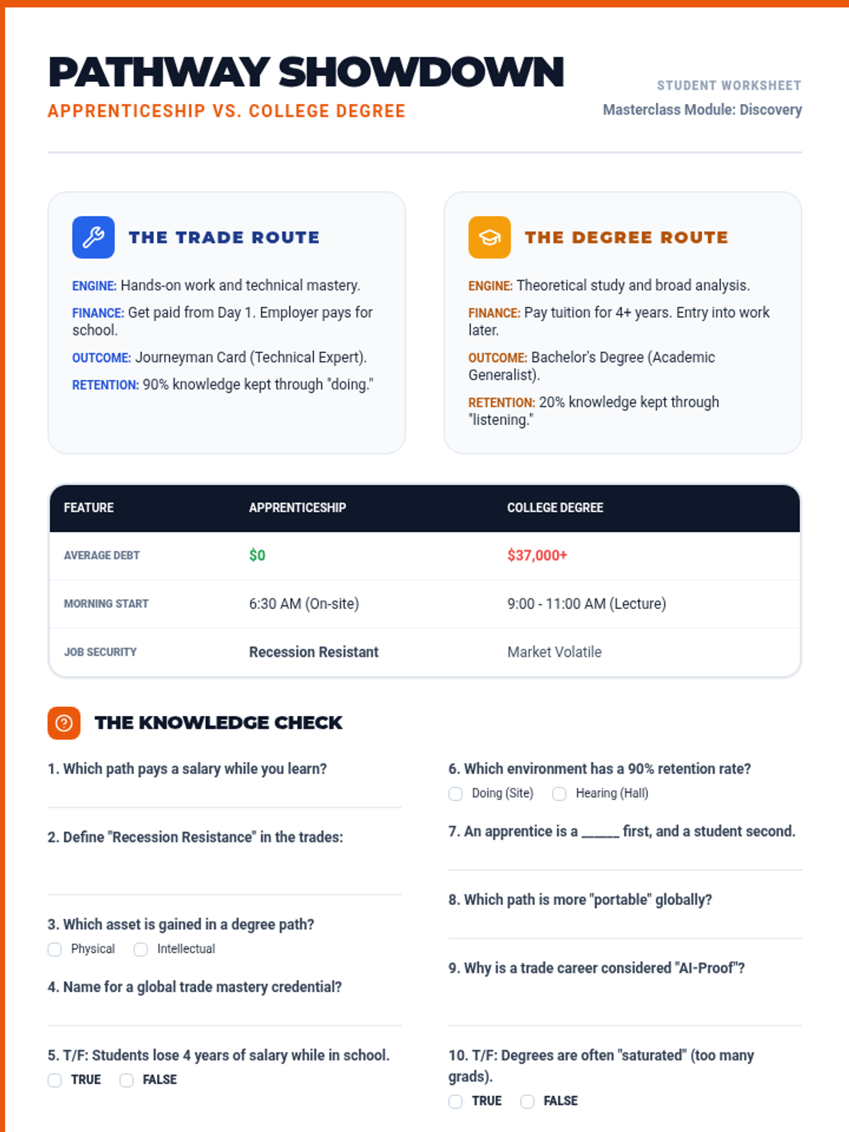 A 1-page informational summary comparing Apprenticeships and College Degrees, featuring a facts breakdown, comparison table, and 10 knowledge-check questions.