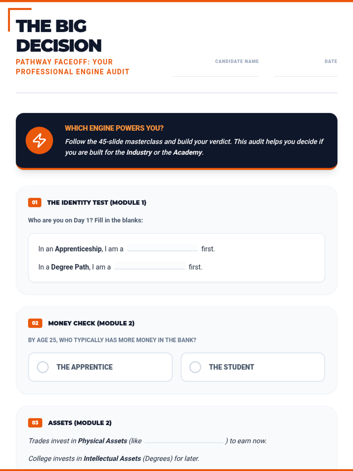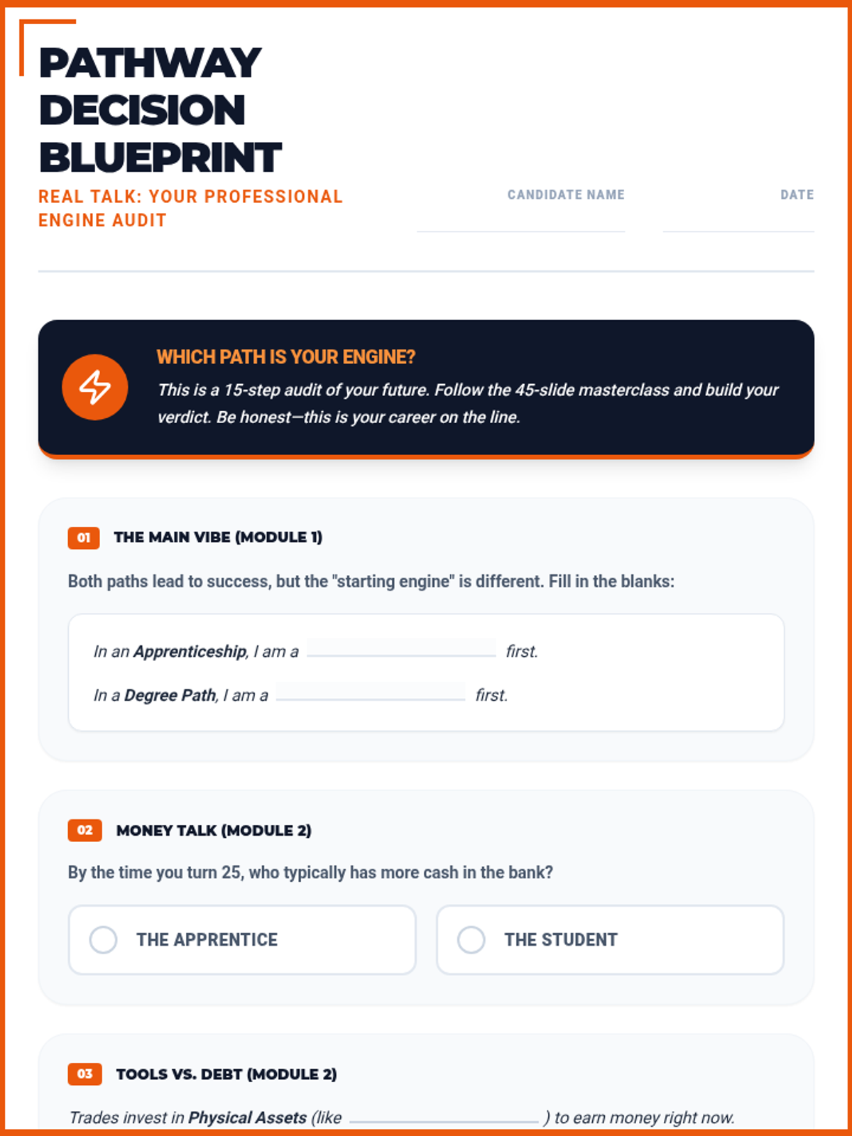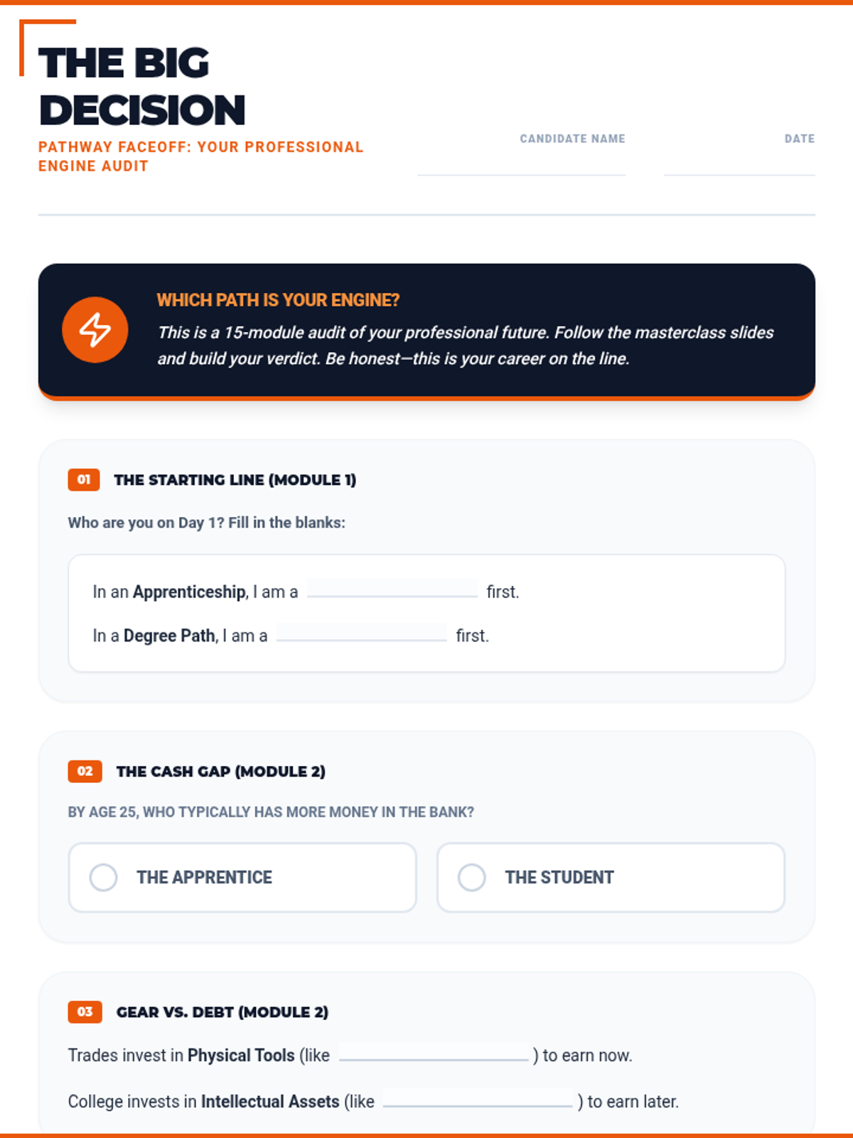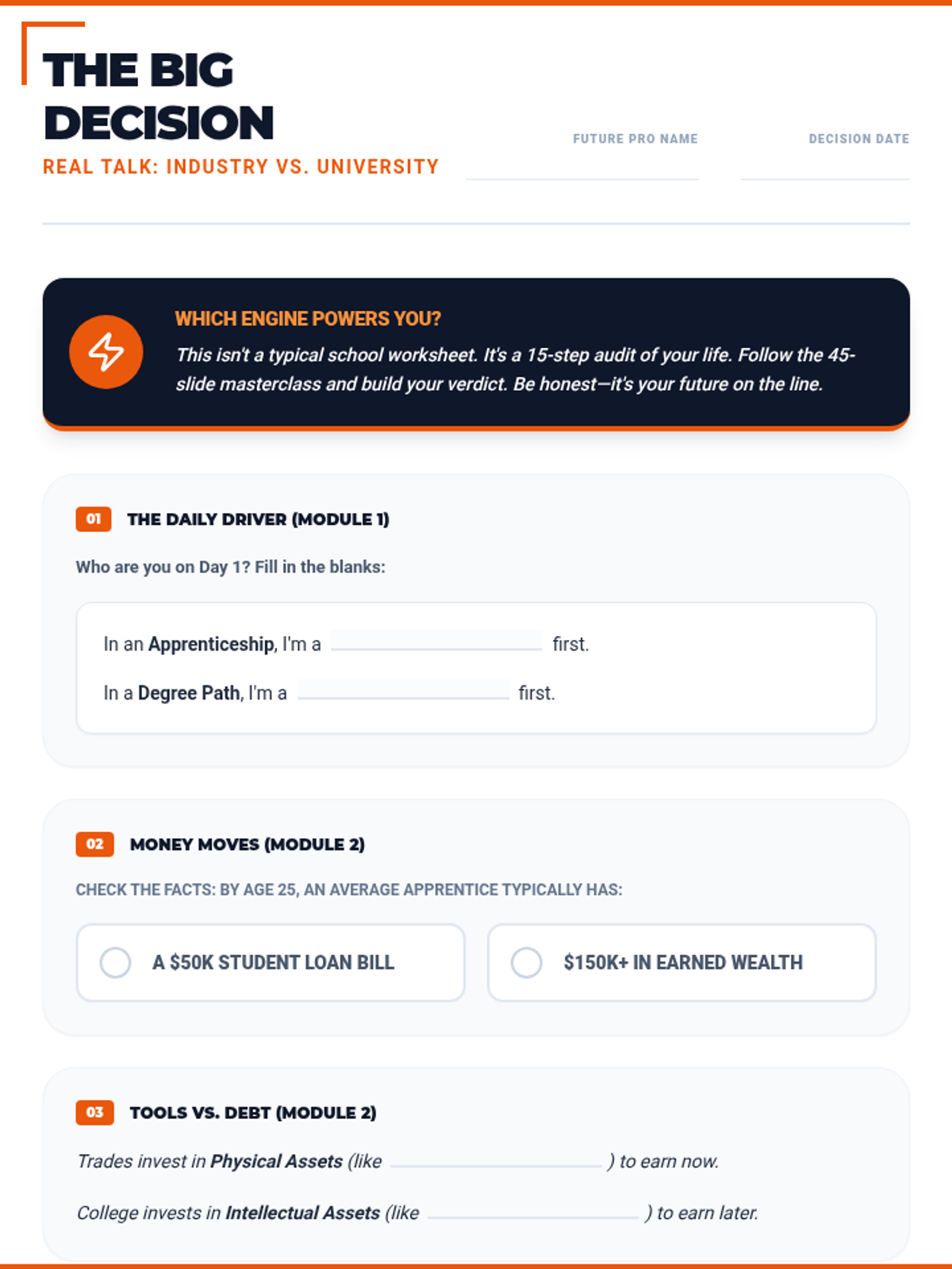 A 15-section career exploration worksheet designed for 16-year-old high school students, featuring punchy, relatable titles and a "Safety Orange & Slate" theme. Meticulously aligned with the 45-slide masterclass. All correct answer highlights have been removed for student use.