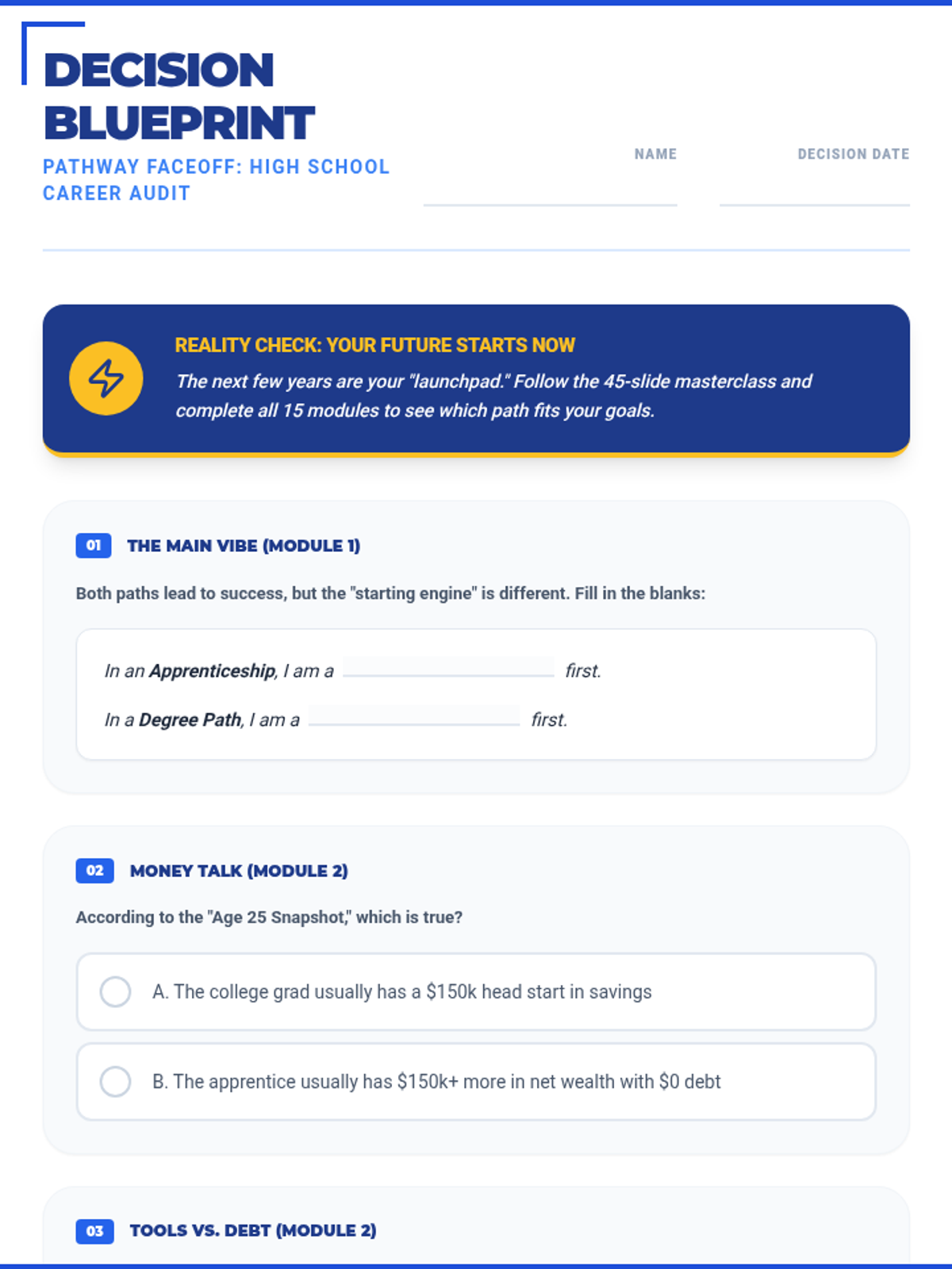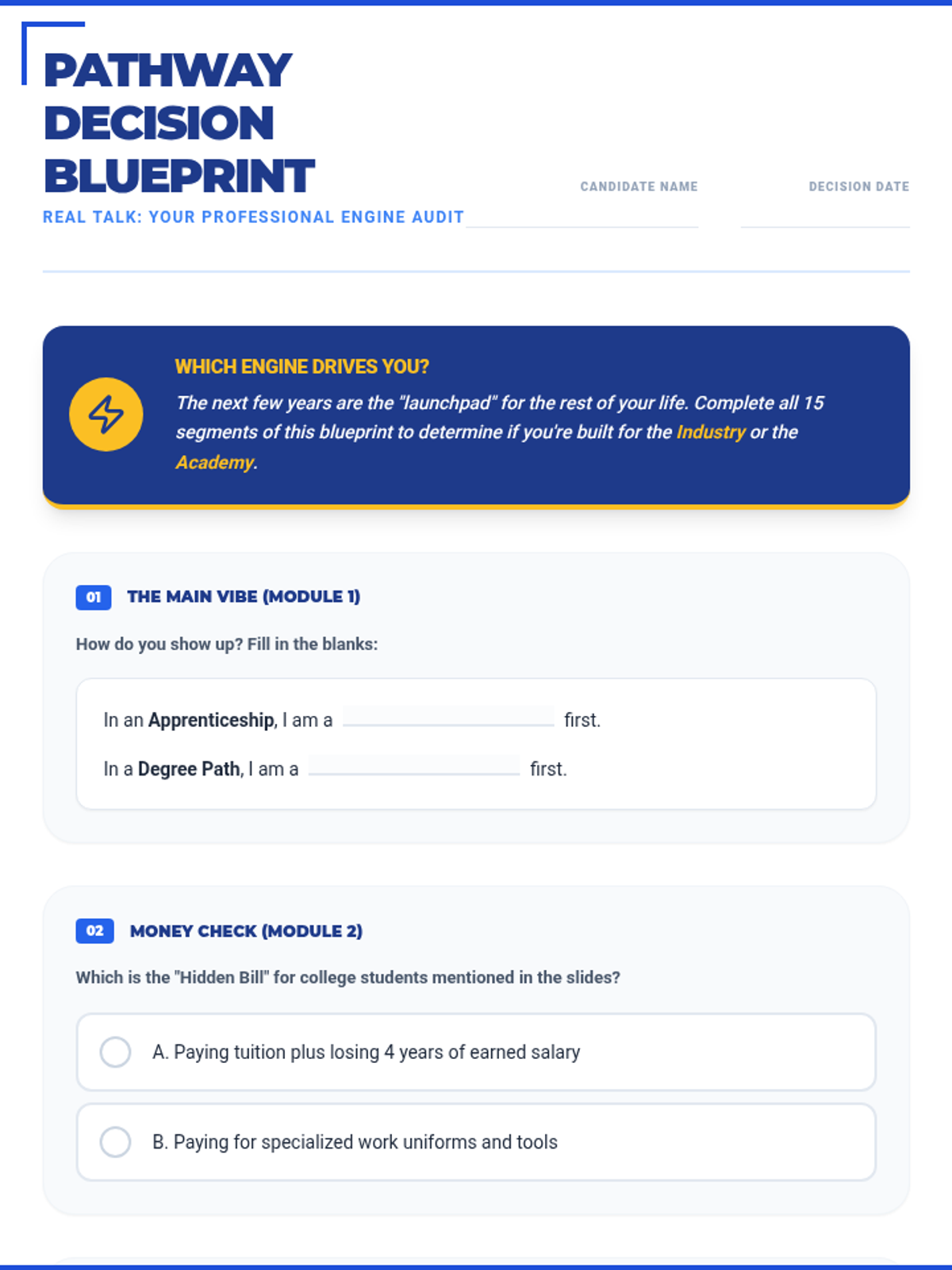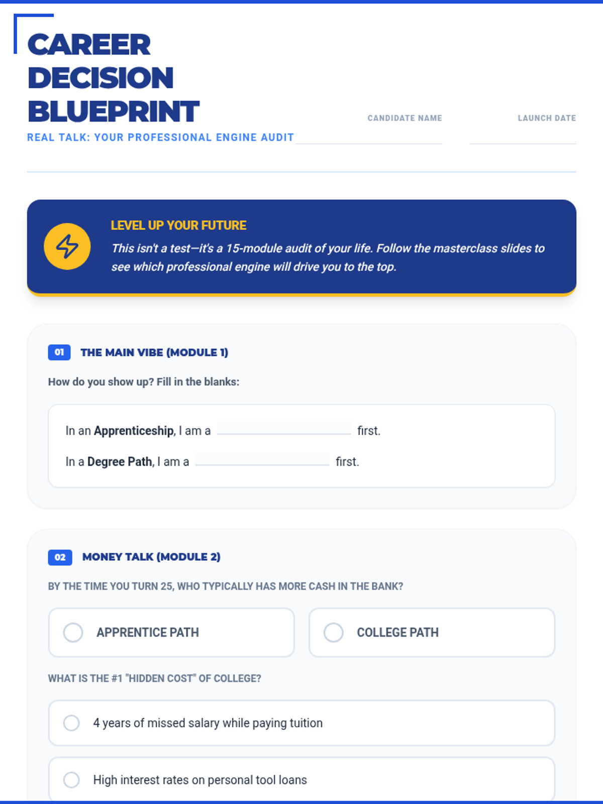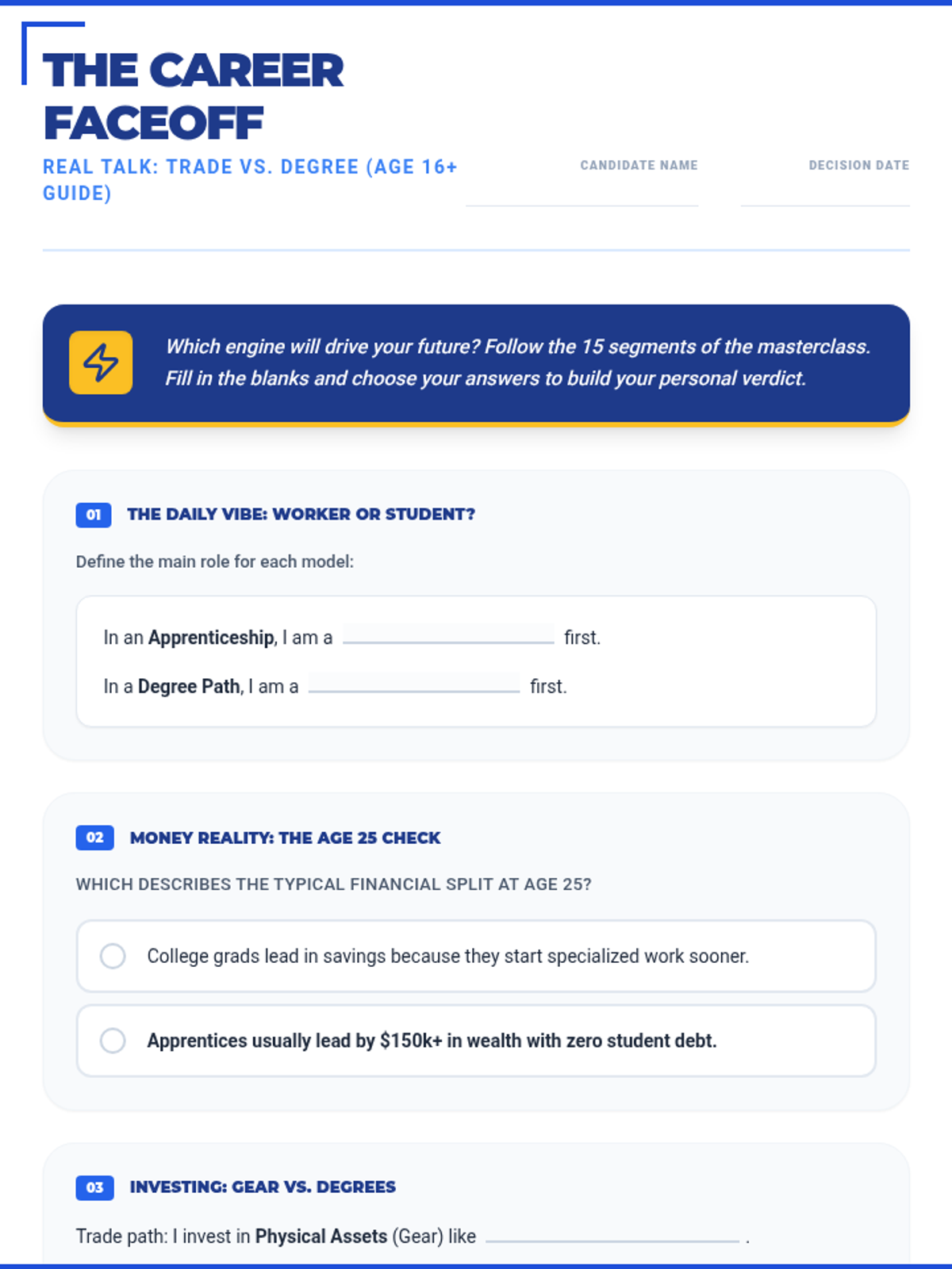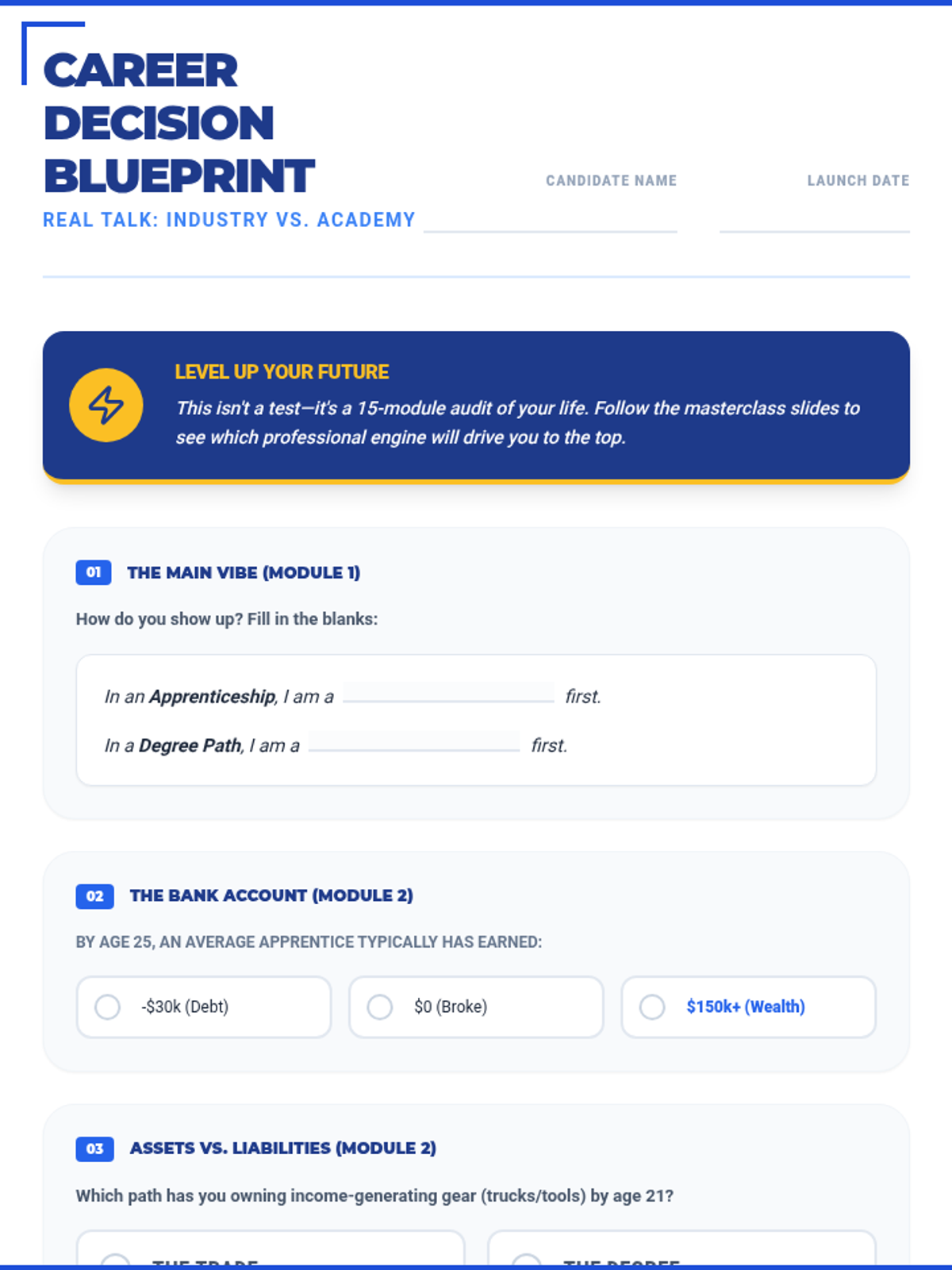 A 15-section career exploration worksheet designed for 16-year-old high school students, featuring punchy, relatable titles and refined "Real Talk" language like "The Vibe Check" and "Why I'll crush it." Meticulously aligned with the 45-slide masterclass. All correct answer highlights have been removed for student use.