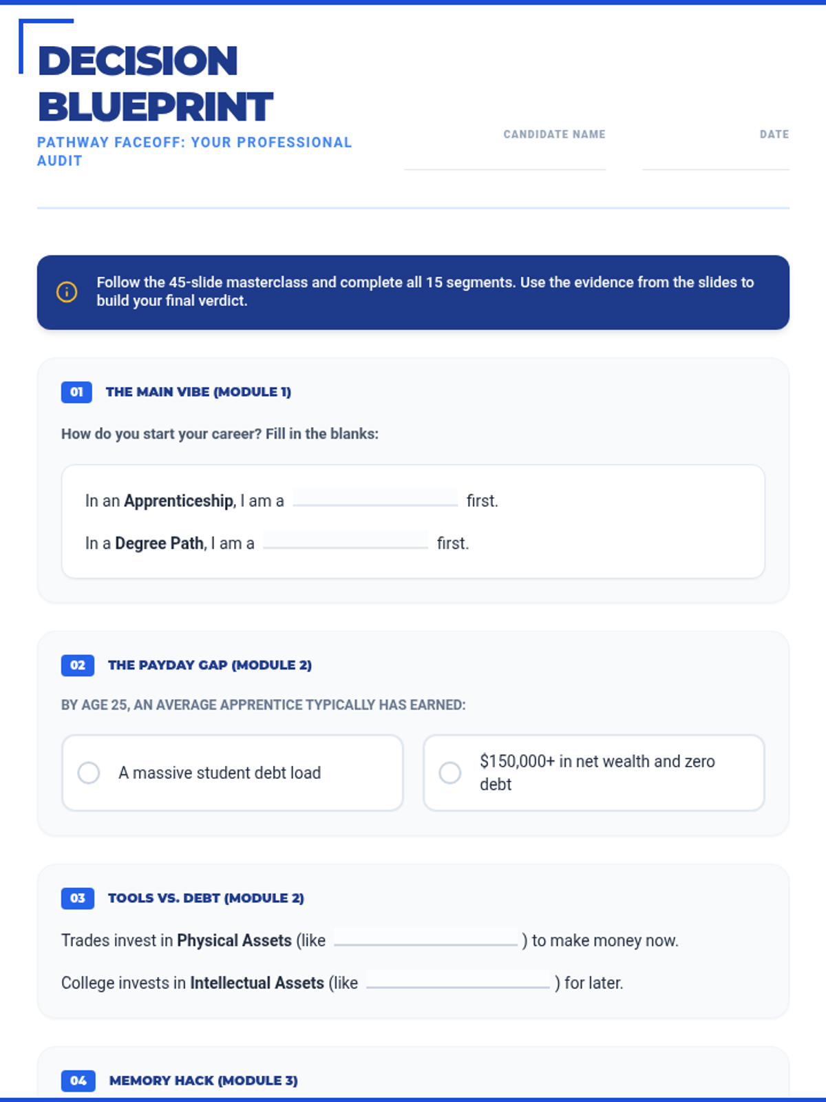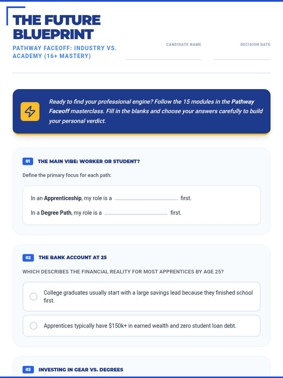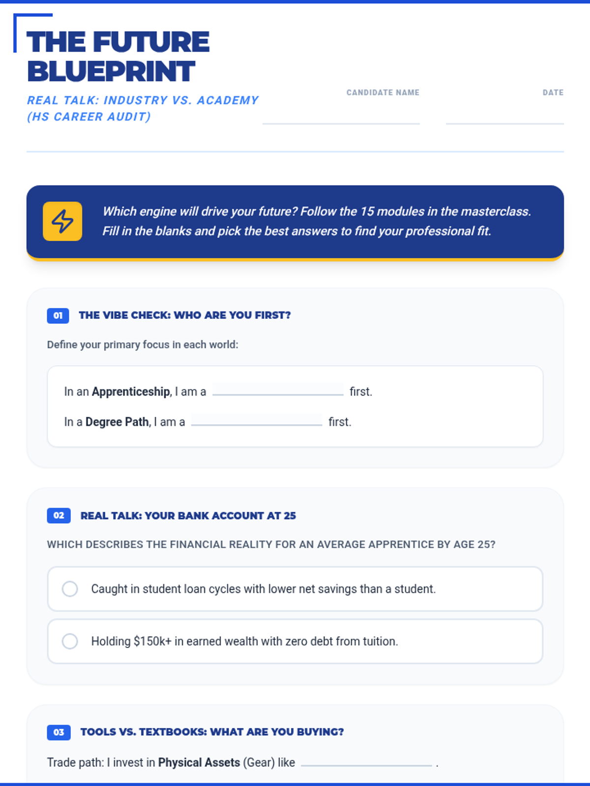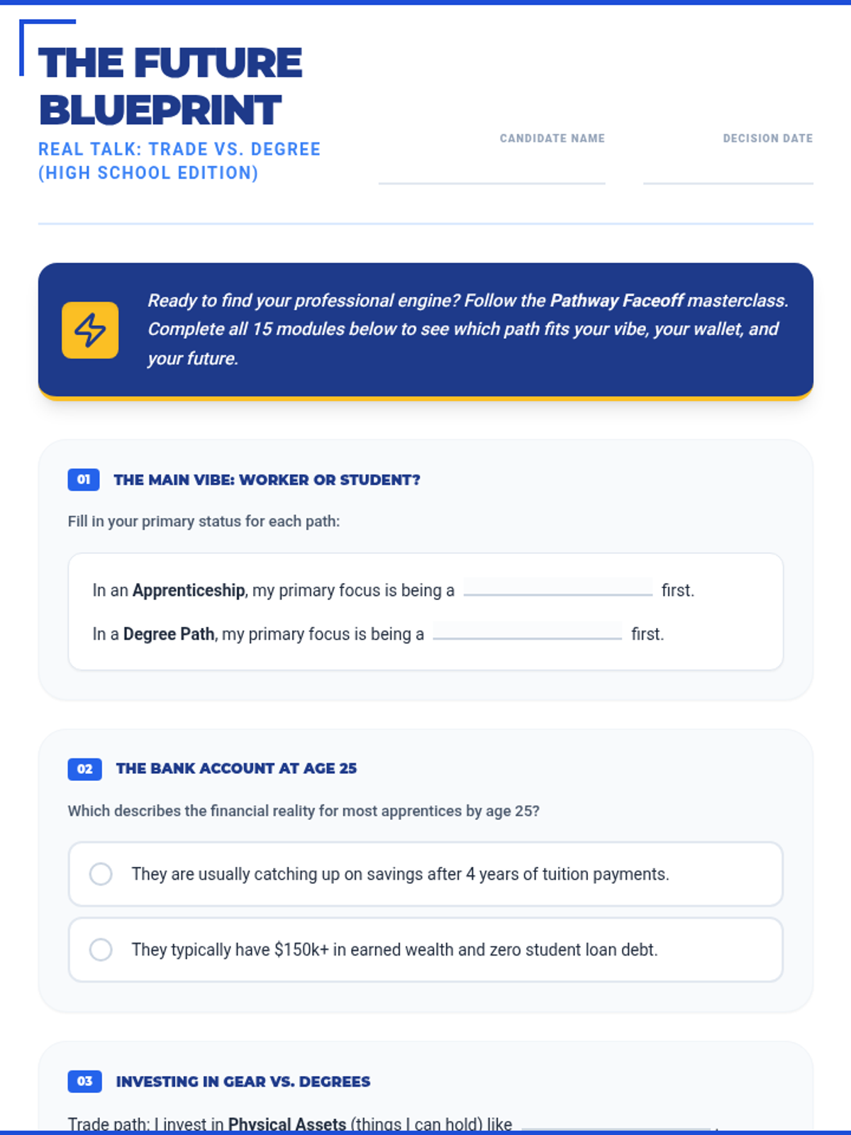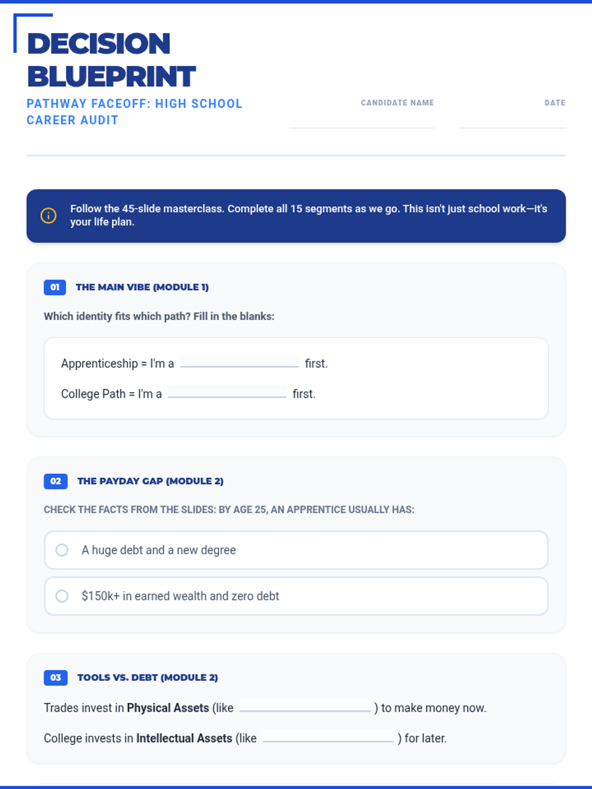 A 15-section career exploration worksheet designed for 16-year-old high school students, featuring punchy, relatable titles and refined "Real Talk" language like "The Vibe Check" and "Why I'll crush it." Meticulously aligned with the 45-slide masterclass. All correct answer highlights have been removed for student use.