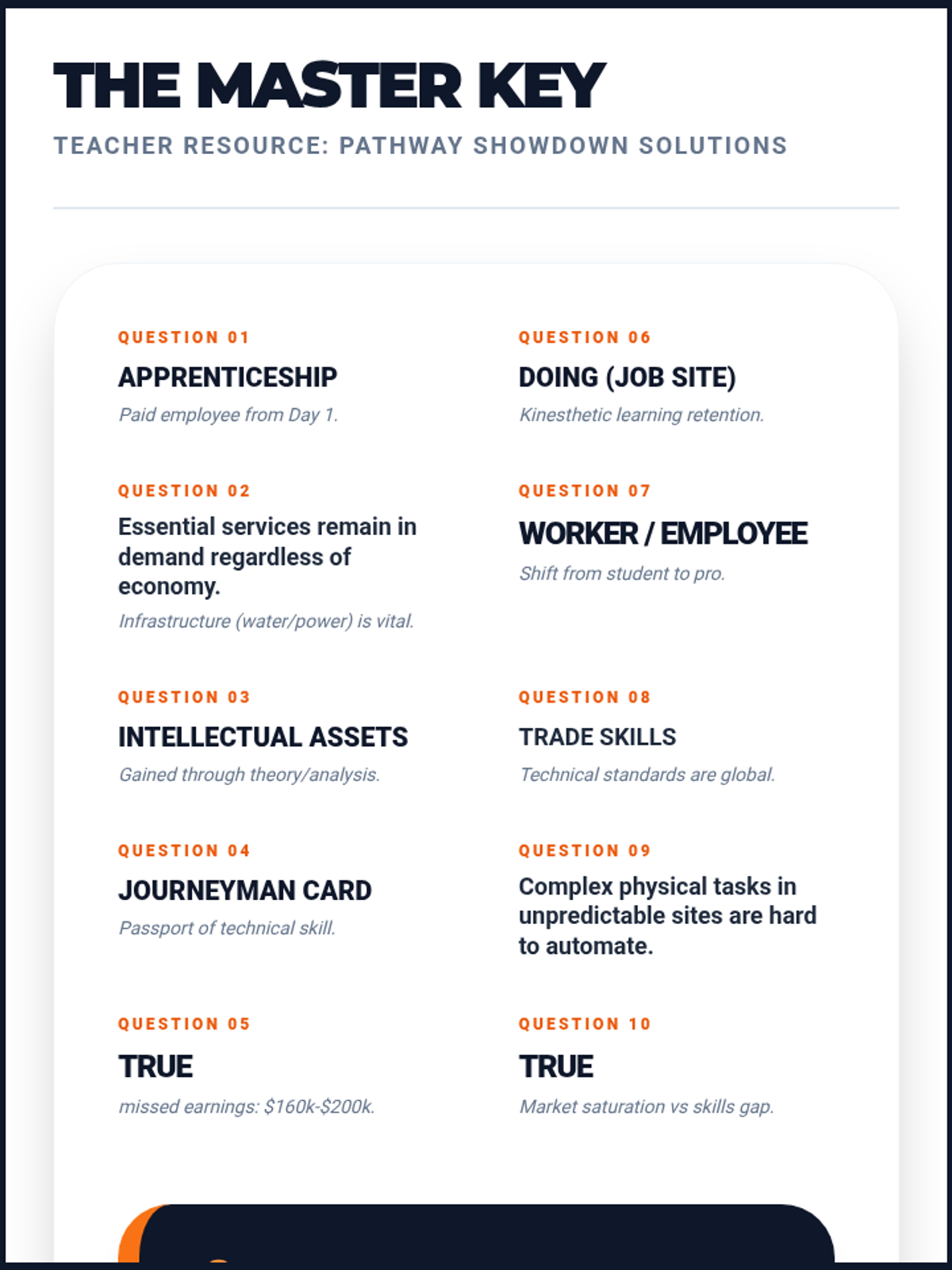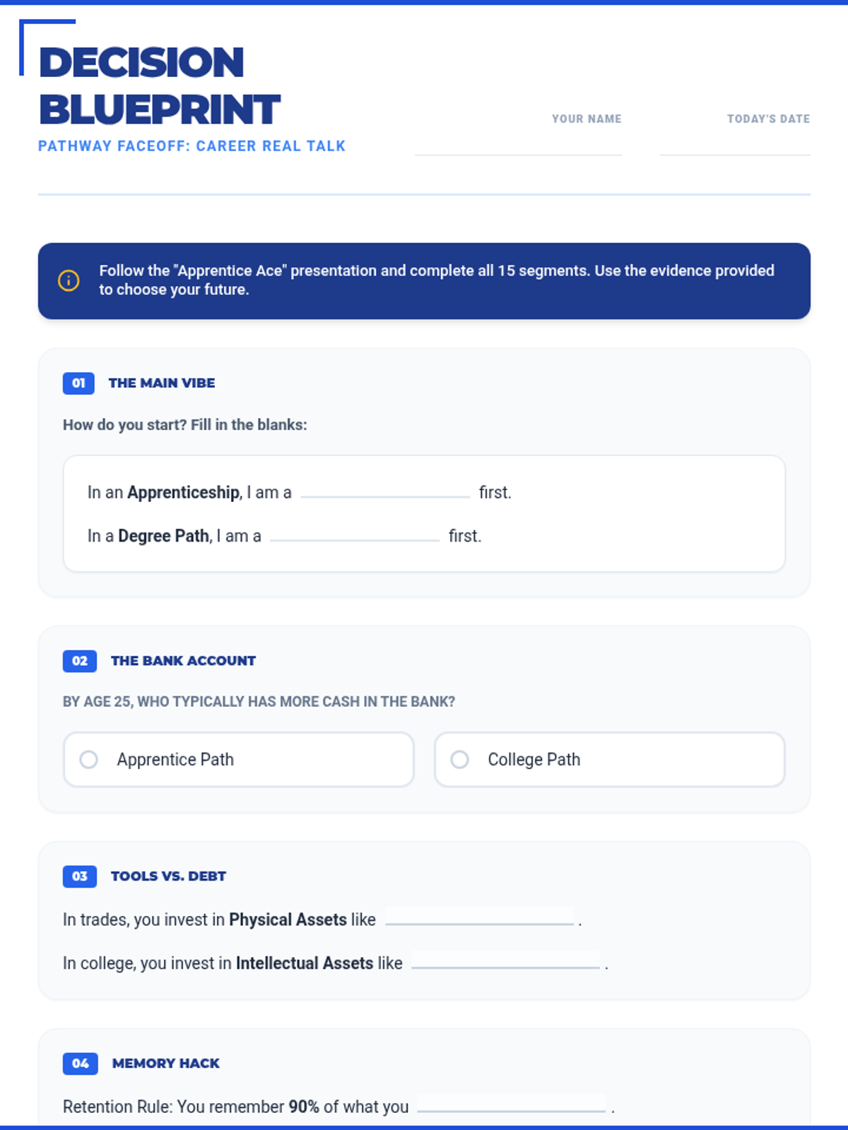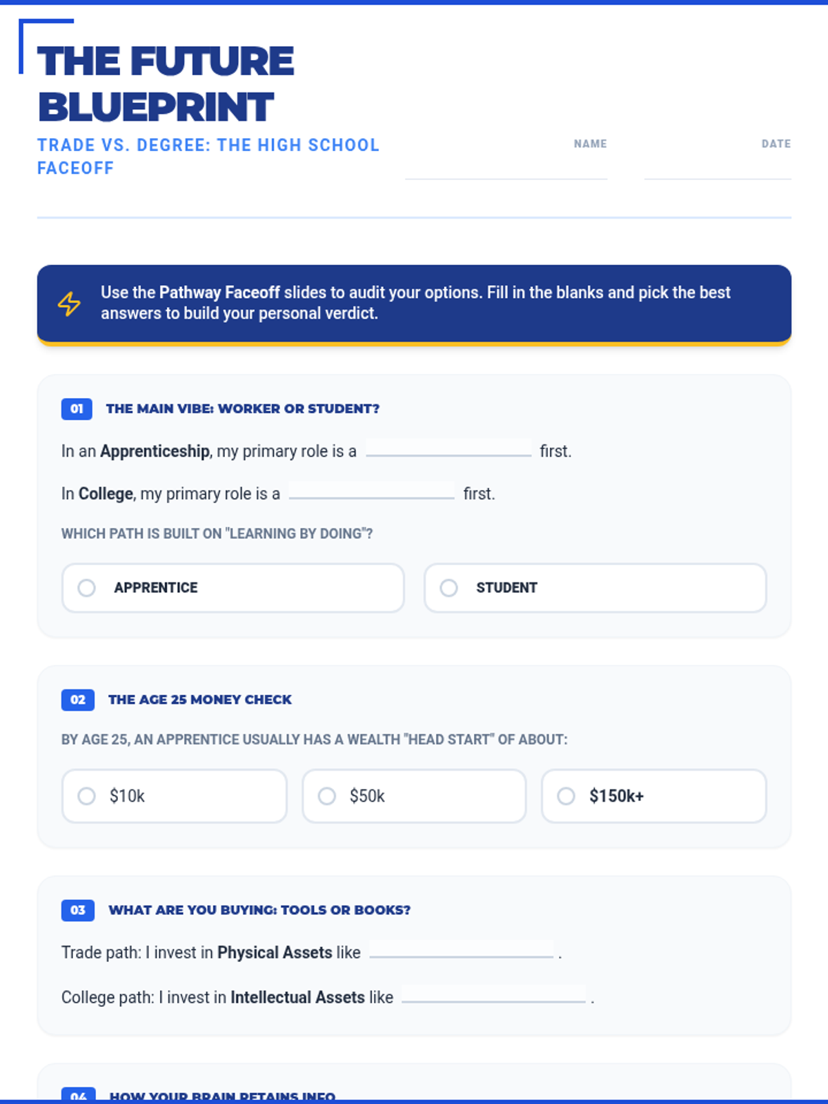 A gamified slide deck covering college vs. vocational paths, career ROI, and essential work readiness soft skills. Includes a Live PBL Path Finder workshop.