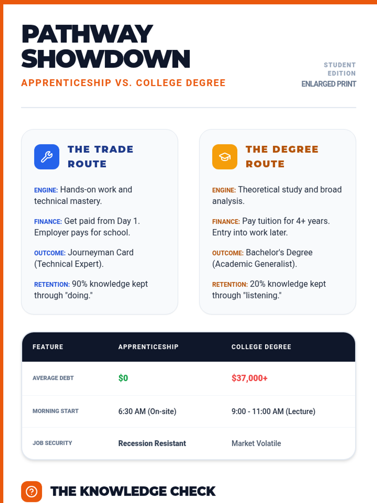 A 1-page enlarged informational summary comparing Apprenticeships and College Degrees, designed for maximum readability. Includes a facts breakdown, comparison table, and 6 key knowledge-check questions.