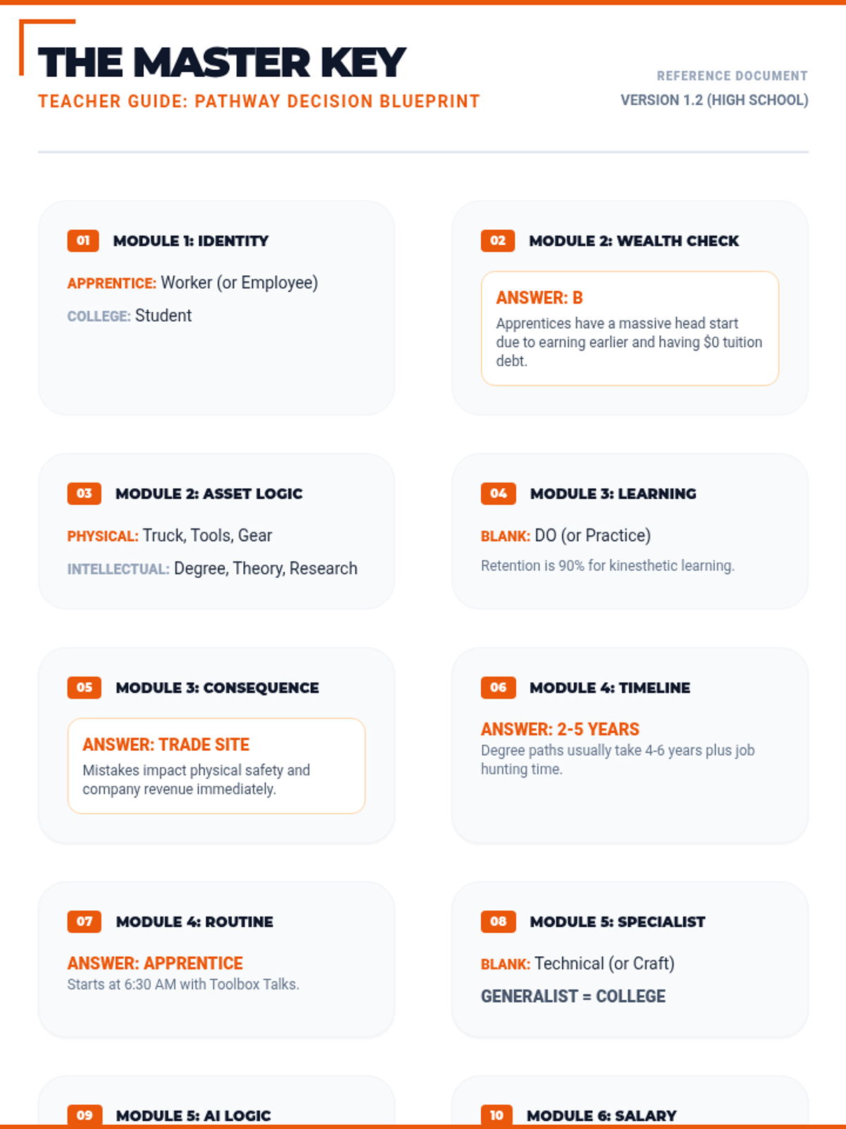 A teacher's master answer key for the Pathway Decision Blueprint Worksheet (15-section version), provided in a clean print layout with a Safety Orange and Slate theme.