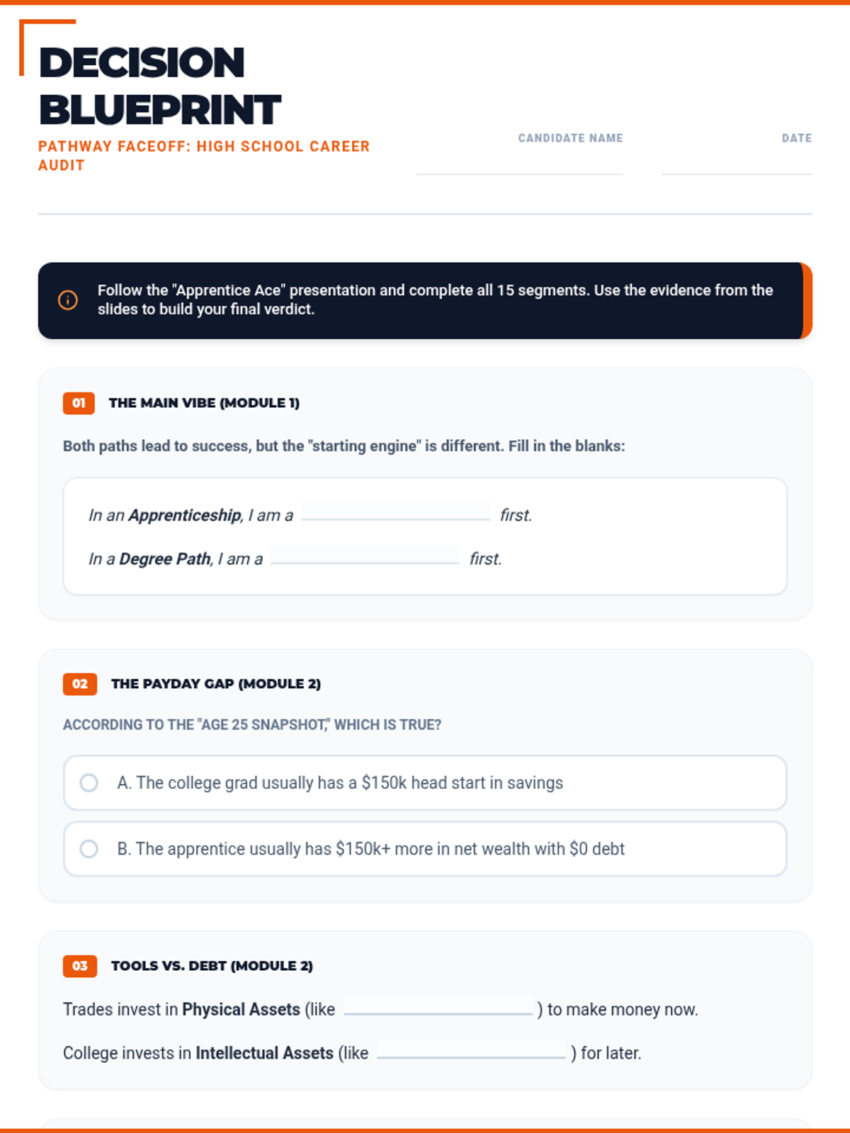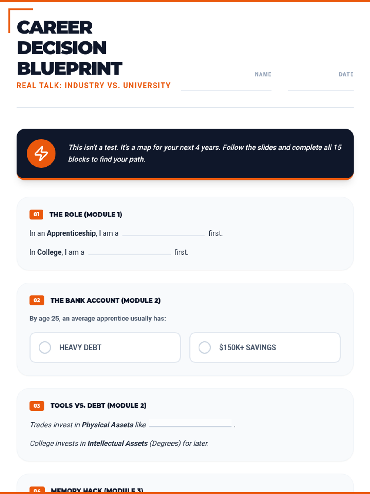 A simplified 15-section career exploration worksheet designed for 16-year-old high school students, featuring punchy, relatable titles and a "Safety Orange & Slate" theme. Meticulously aligned with the 45-slide masterclass. All correct answer highlights have been removed for student use.