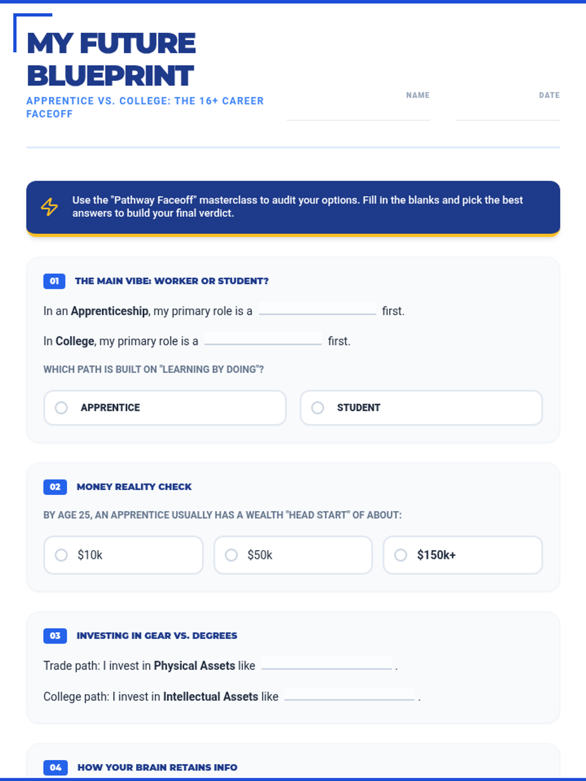 A high-impact, gamified student portfolio document designed as the primary deliverable for the course. Students complete tasks for all six levels, including budgeting, STAR drafting, insurance comparison, and ROI scouting. Updated v3.0 with improved layout and maximum whitespace. Expanded to 8 dedicated pages for printable consistency.