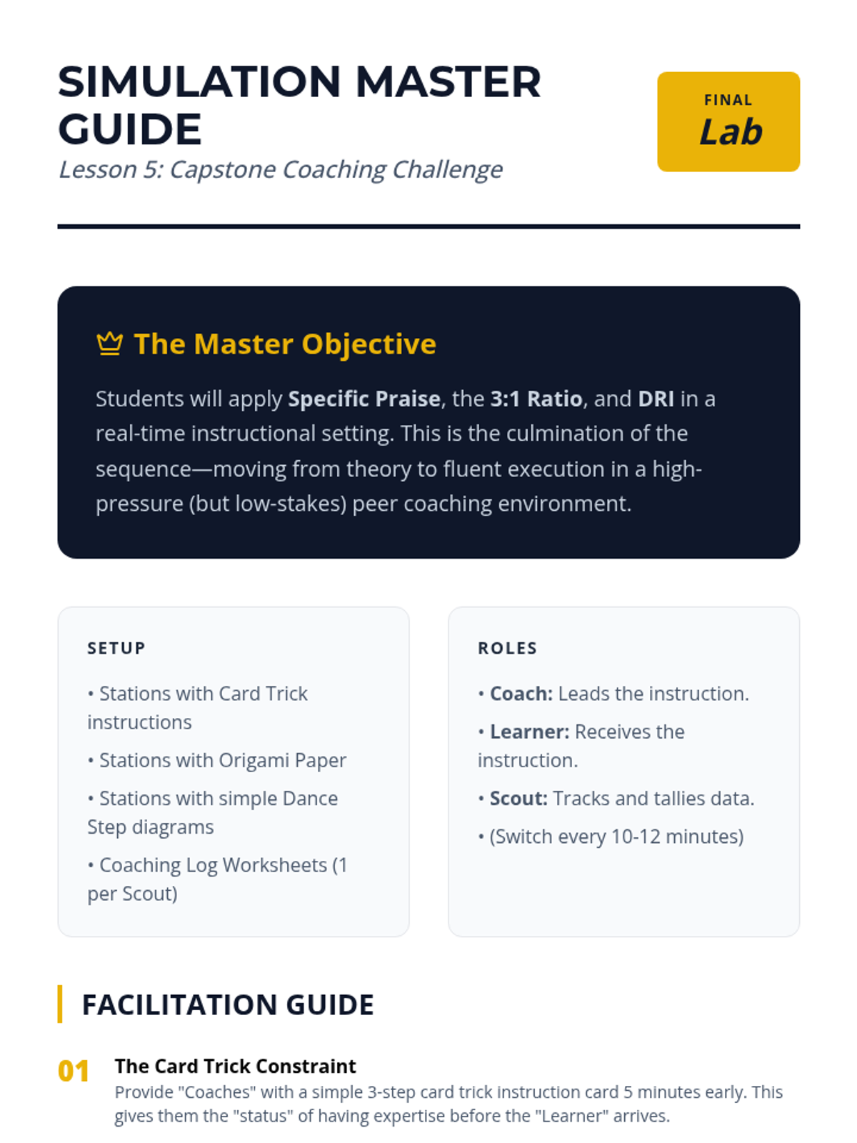 A teacher guide for Lesson 5 including card trick instructions, simulation logistics, and master debrief prompts for the Coaching Challenge.