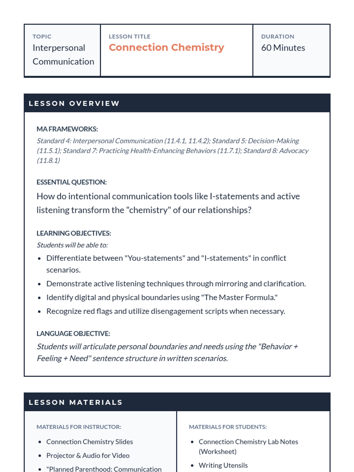 Comprehensive lesson plan for the Connection Chemistry unit, detailing curriculum alignment, learning objectives, and a 60-minute instructional agenda featuring slide-based instruction and scenario-based practice.