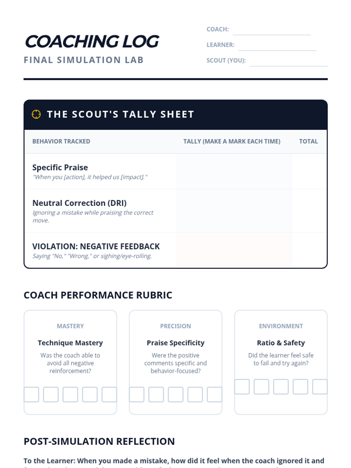 A worksheet for students to record tallies, rate performance, and reflect on the final coaching challenge simulation.