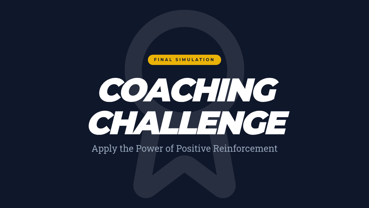 A slide deck introducing the final coaching challenge simulation, where students apply all positive reinforcement techniques learned in the sequence.