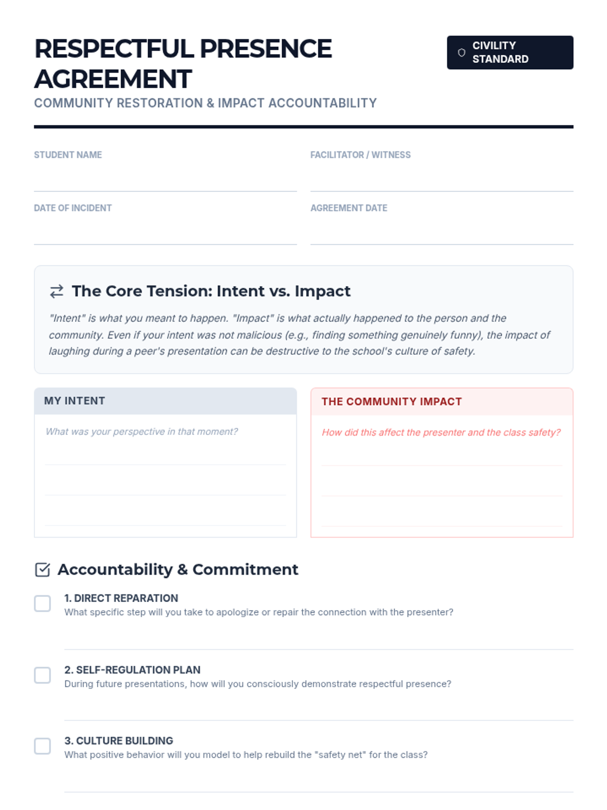 A high-school level behavioral contract using the "Intent vs. Impact" framework to address peer mockery during presentations. It guides students through a reflective process to acknowledge communal harm and commit to specific restorative actions that improve school culture.