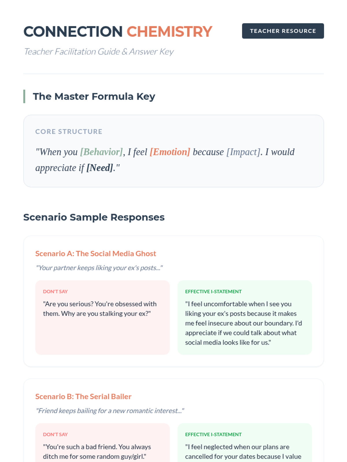 Teacher-facing answer key and facilitation guide for the Connection Chemistry lesson. Includes sample I-statement responses for scenarios and instructional tips for managing classroom activities.