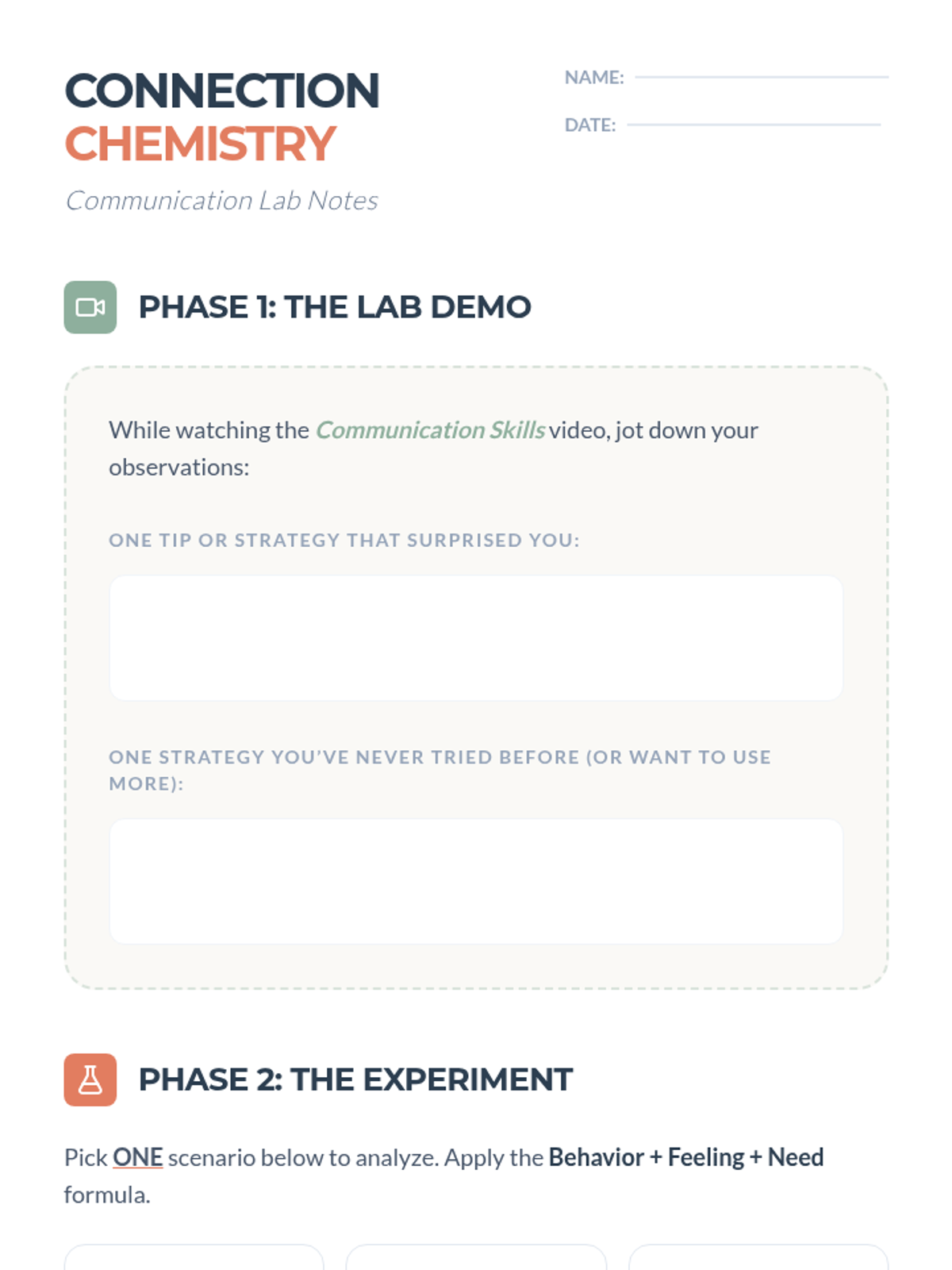 Scenarios and facilitator notes for the active listening workshop, providing students with structured practice in emotional validation and 'holding space' for peers in distress.