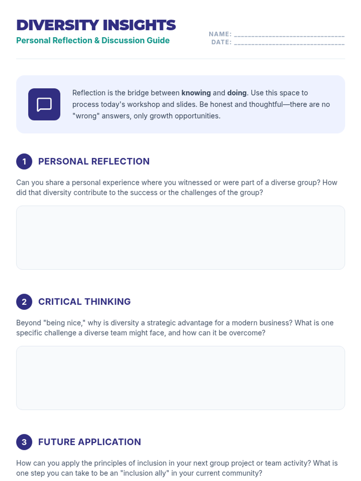 A guided reflection sheet for students to document their personal insights, critical thinking, and future applications of diversity and inclusion principles.